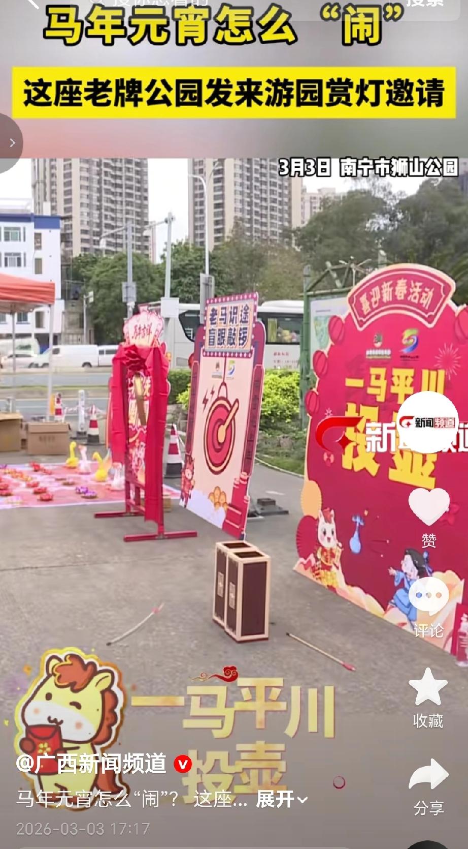 3月一号到3月3号南湖公园,灯映南湖·谜动邕城2026元宵灯谜游园活动免费开放,不设限,可猜趣味灯谜、赏水幕光影。(来源于@广西新闻频道 )