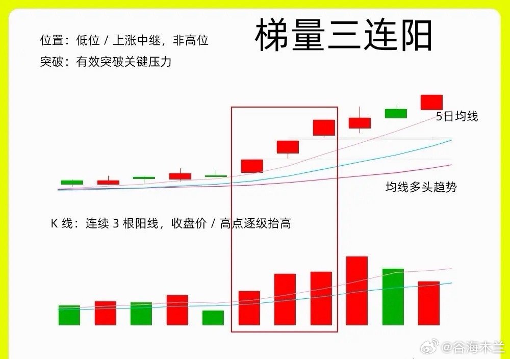 注意了!梯量三连阳到底是真拉升还是主力的出货呢?我们都知道成交量的放大,其他就代表的市场分歧,有卖有买才能成交。那怎么才能判断呢?今天一期内容告诉你还是老规矩,点赞收藏或评论888支持一下,我每天分享炒股干货,以免以后想温习找不到了什么是梯量三连阳呢?连续三天K线出现阳线,底部出现抬高,没有上下影线,阳线中间也没有阴线,成交量一天比较一天要大,和我们说红三兵相同连续的上涨,是否是真拉升,我总结了四种逻辑一。股价位置:一般出现低位或是上涨趋势的初期,股价并没有多少涨幅,那就可靠,只有在低位出现梯量三连阳,往往就是主力建仓或是走势的启动二、突破:连续的上涨,突破了上方的压力位,并且次日并没有出现回调,稳稳的站上了压力位,主力承接了上方的抛压力量三、成交量:连续阳线,成交量是出于一直温和放量的形态,并不是突然爆涨,形成巨量或天量。四、回踩有底:连续的上涨,股价并没有出现大幅下跌,而是能站稳短期均线之上。均线一直处于一个多头趋势。如果连阳之后出现,大幅下跌,跌破均线,形成断头铡刀形态,那就要谨慎了好了!以上就是今天全部内容。希望对大家有启发,也是最为基础的内容,一定吃透。我们下期内容再见