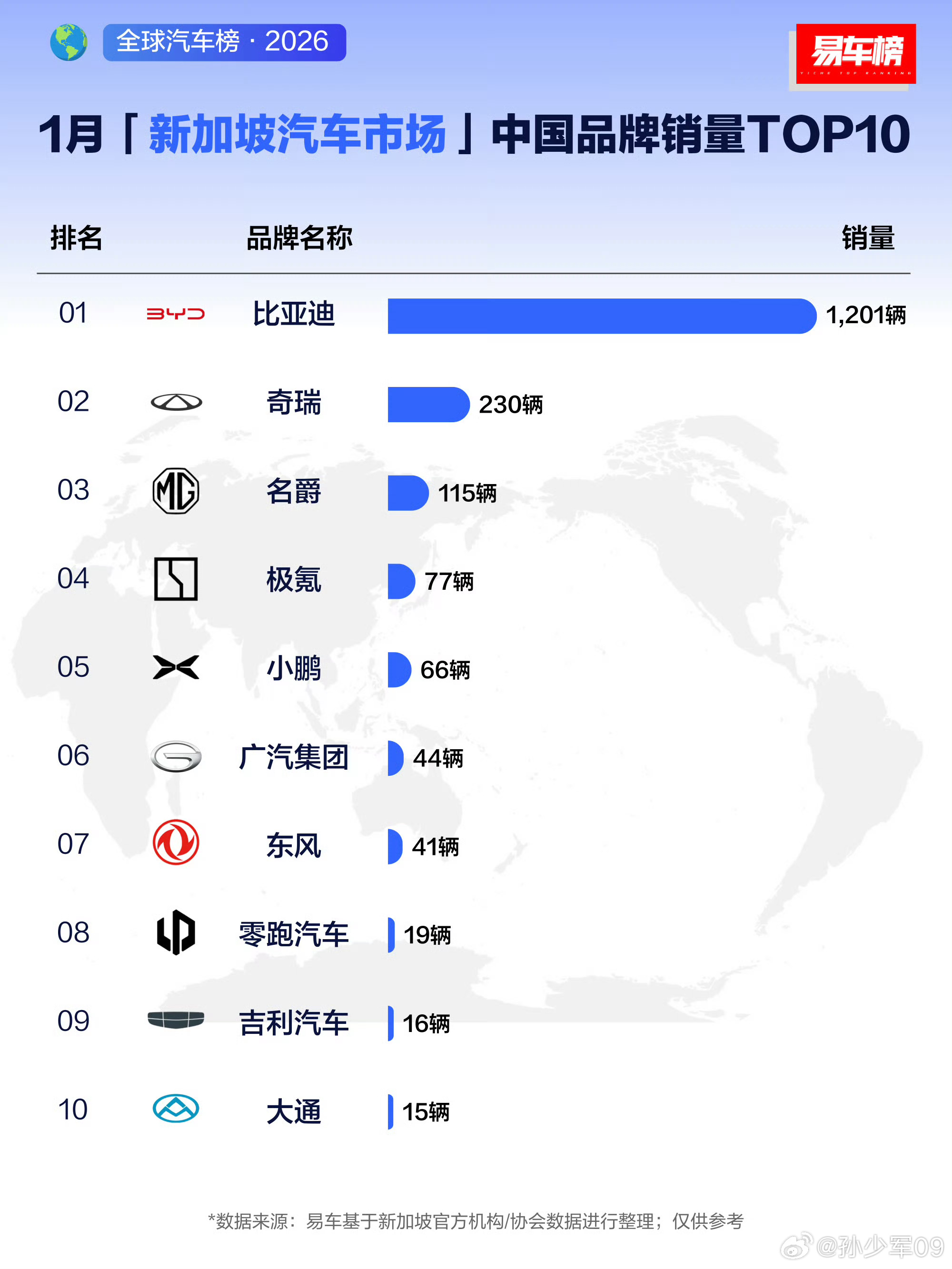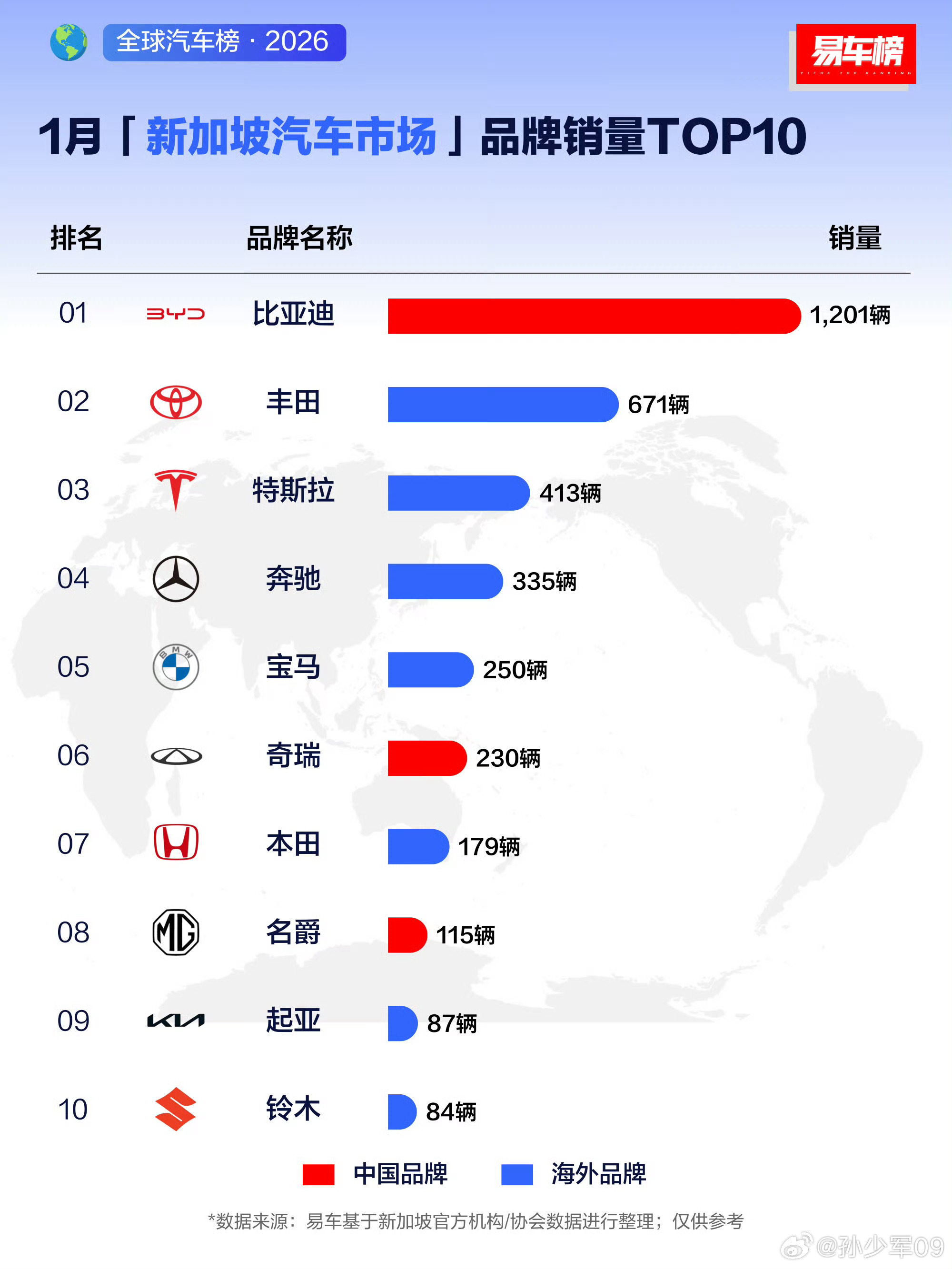 2026年1月新加坡汽车销量排名