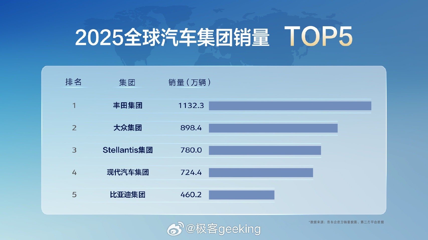 让所有人振奋的一个好消息,全球五大车企终于有国产汽车品牌了!根据各家车企相继公布的 2025 年度销量数据,全年的销量榜单由此清晰起来,其中非常瞩目的是,比亚迪以全年 460.2 万辆的成绩首次进入全球车企集团销量前五,这也是国产汽车首次进入世界前五,可见中国车企刷新历史!