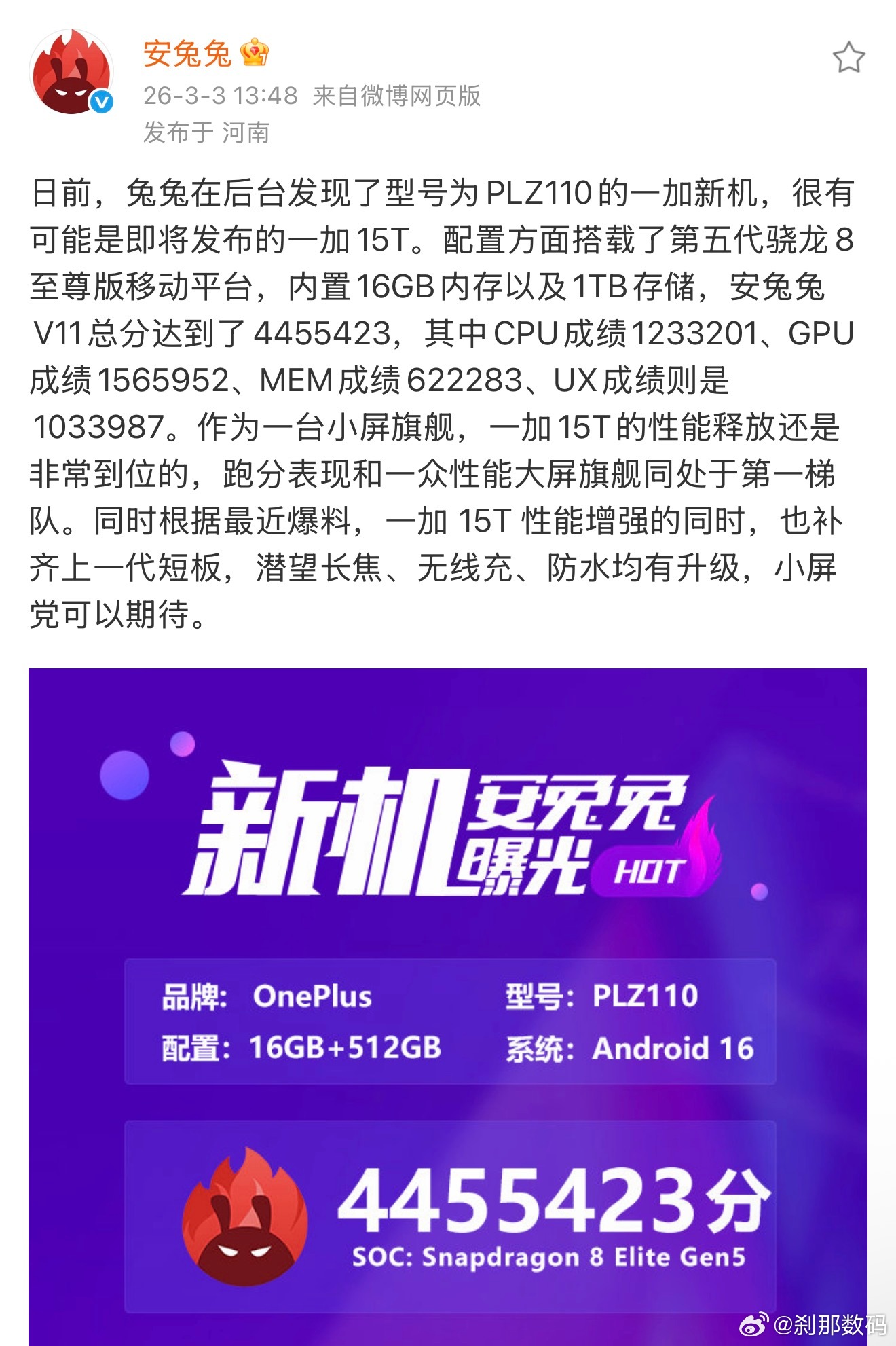 历来做小尺寸手机,厂商都会妥协,砍影像、电池、降频、做阉割......毕竟机身空间的物理限制摆在那,散热和堆叠是硬伤。但刹那今天看一加15T,跑分居然能到第一梯队。结合刚出的2月安兔兔性能榜来看,前排清一色是iQOO 15 Ultra、红魔11 Pro+这种大尺寸性能怪兽,一加15T这445万分要是塞进去,完全能跟这些大屏机硬刚一下,小尺寸里估计就找不到对手了。其中GPU和UX的成绩也是盖过了市面上不少主打散热的大屏机,说明一加这次的内部堆叠和性能调度相当激进,没有因为尺寸小就锁画质或降频。从爆料来看,15T还补齐了潜望长焦、无线充和防水,基本是把短板全焊死了,真正的性能小夯机,作为13T用户表示很欣慰。对于追求单手握持,又不想在核心体验上做任何降级的人来说,一加15T这套配置可以说是目前最接近小屏党Dream Phone的形态了,但能不能卖的好最终还得看售价香不香。一加15T