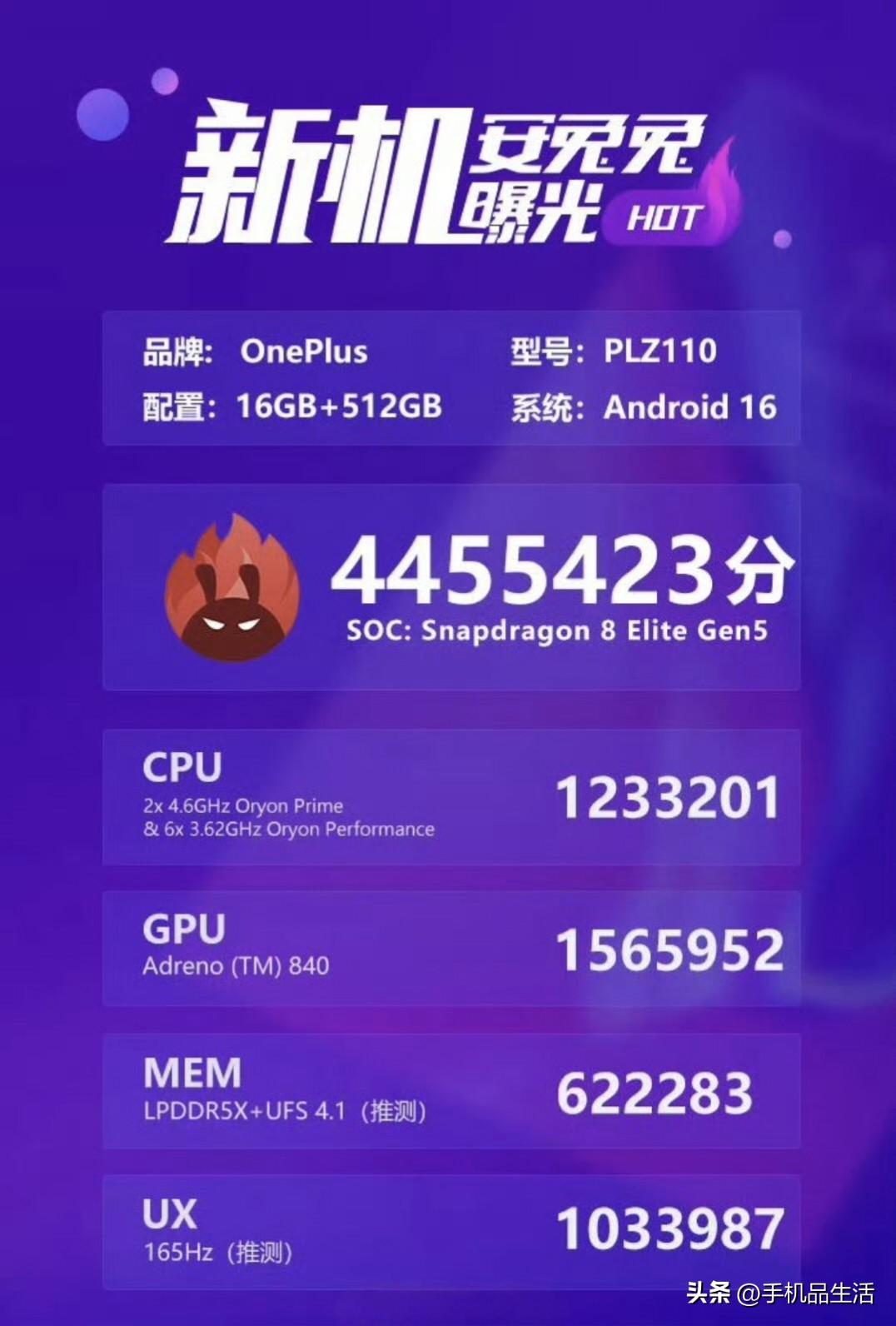 曝一加 15T 手机安兔兔跑分445 万! 一加 15T 安兔兔跑分曝光,搭载高通骁龙 8 Elite Gen5处理器,跑分 445 万,性能属于第一梯队了,关键还是小屏旗舰,一加 15 跑分也就 430 万左右。 其它配置还有 7 开头的大容量电池,支持 100W 有线快充+无线充电,3D 超声波指纹,金属中框,支持 165Hz 超高刷,补齐上代没有长焦的短板。 一加15t 一加 15T