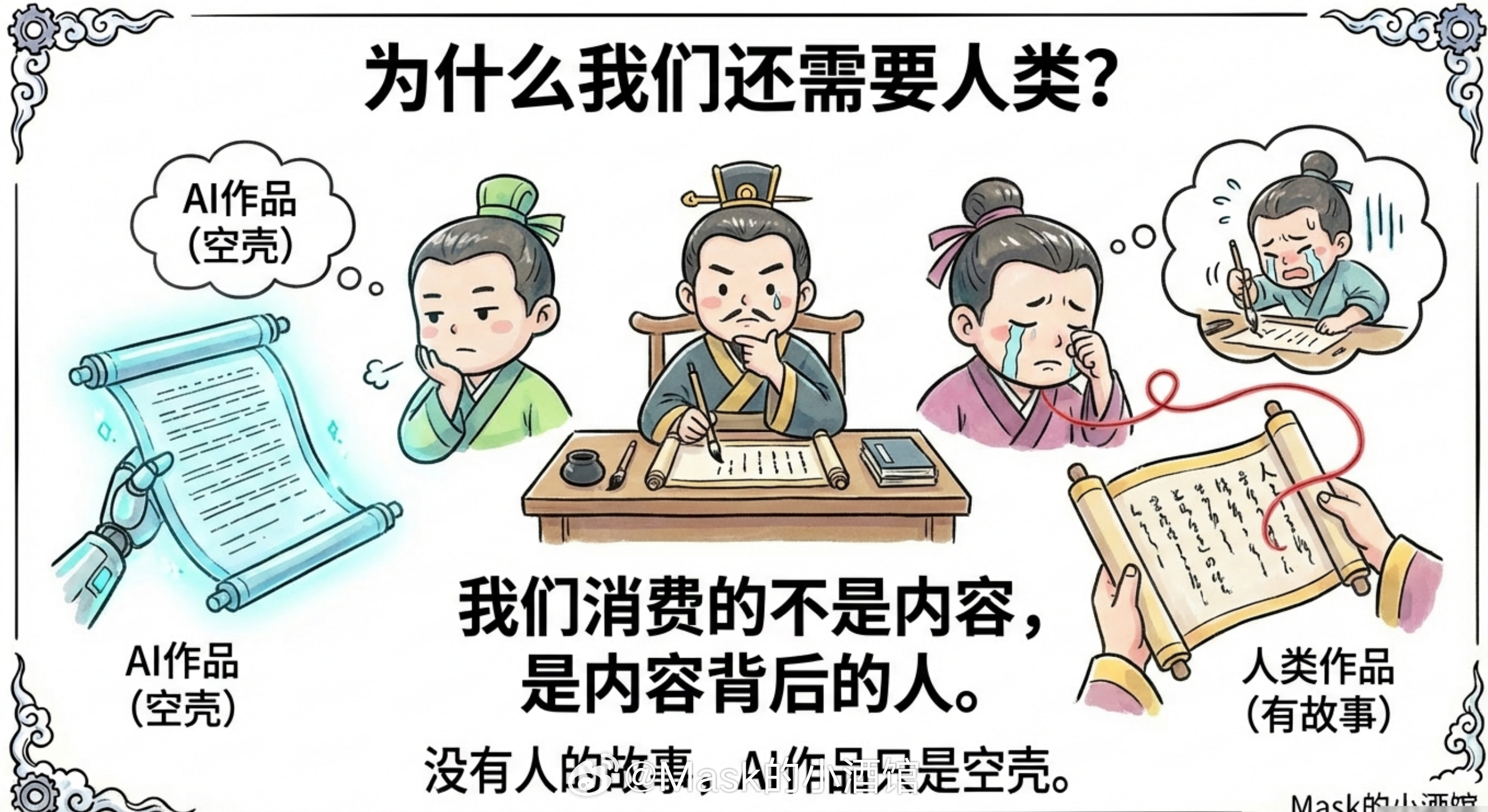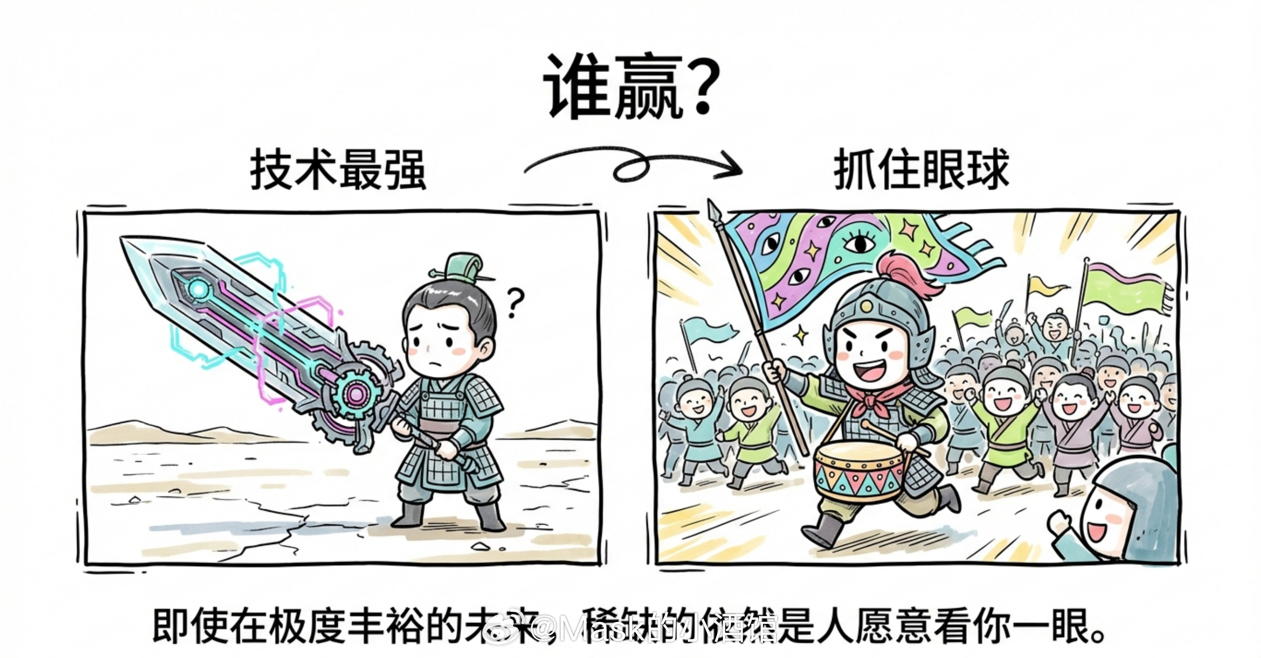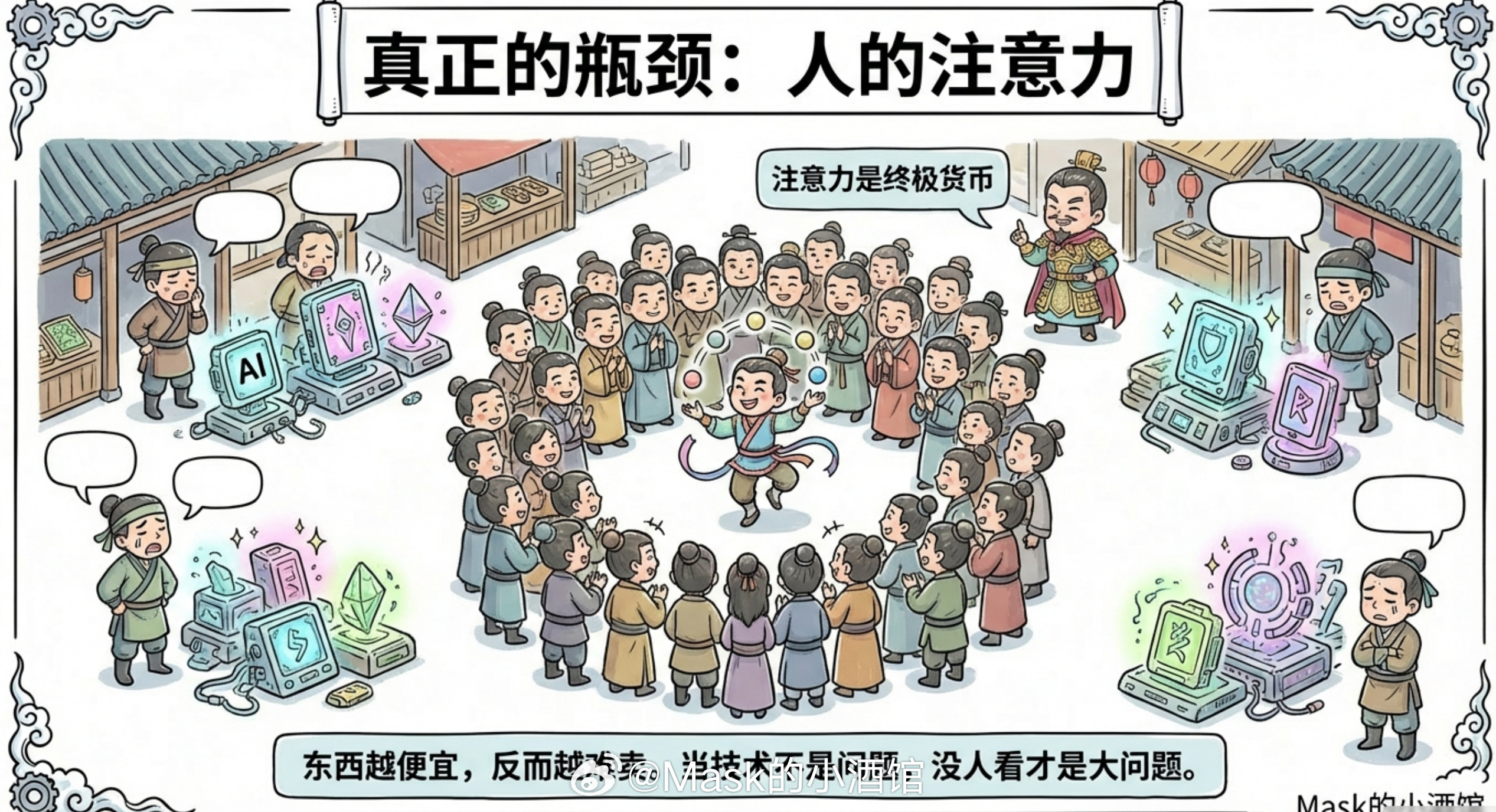 当所有东西都能被AI快速生产出来的时候,唯一稀缺的就是人愿意看你一眼。你做了个很屌的东西又怎样?别人正刷抖音呢,凭嘛要看你的东西?所以未来的商业逻辑就变了呀:不是谁技术强谁赢,而是谁能抓住眼球谁赢。即使在极度丰裕的未来,人类注意力依然是终极货币!