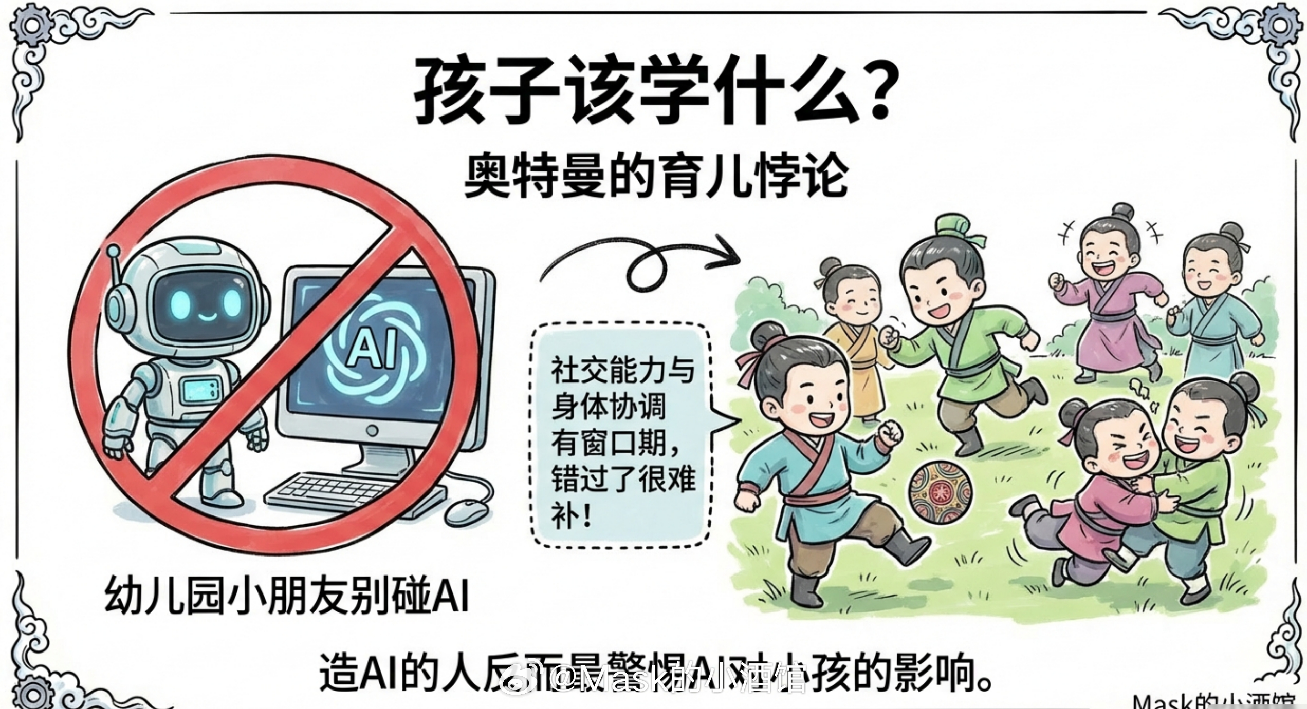 你仔细想想,确实是这么回事。然后有个大学生问奥特曼,AI这么牛批,学校里该咋教孩子嘞?奥特曼的回答让大家都愣了下。他说幼儿园应该少用电脑,多让孩子在外面跑,跟真人玩。他自己现在有了娃,立场变得很明确:别让幼儿园小朋友碰AI,甚至电脑都不该碰。这个立场挺有意思:造AI的人反而最警惕AI对小孩的影响。他说社交媒体对青少年的伤害已经很明显了,但科技对更小年龄段孩子的影响可能更严重,只是大家讨论的少。