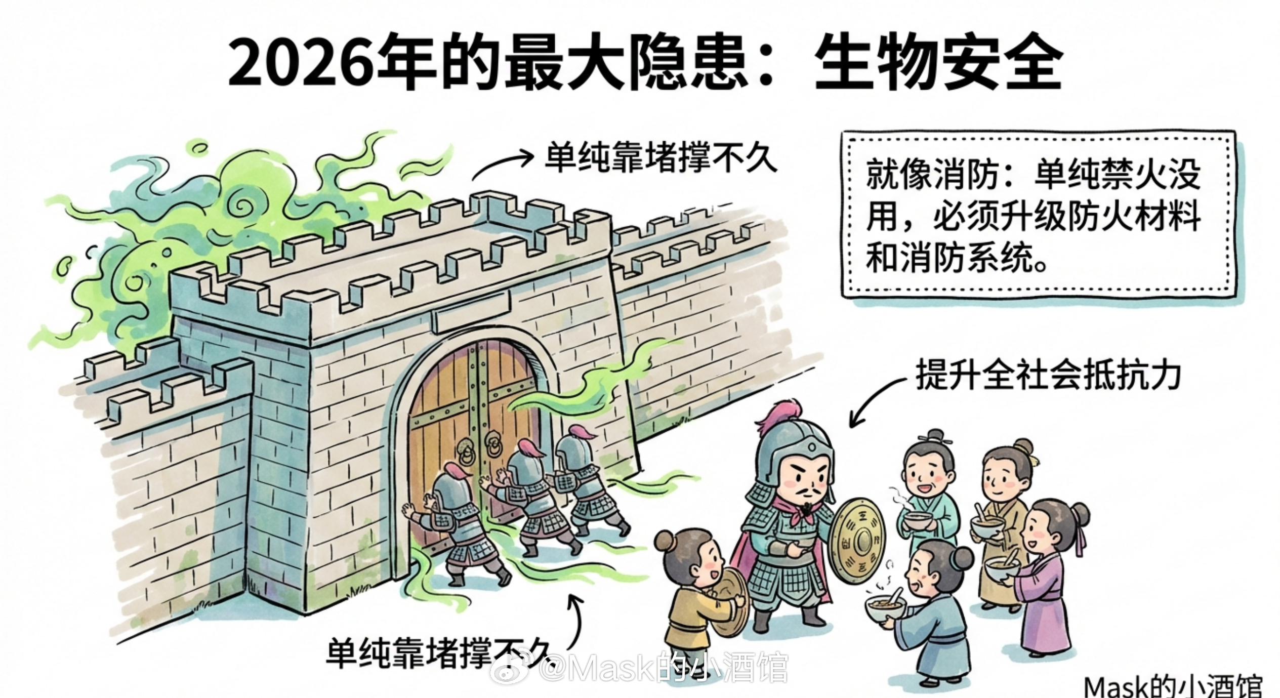 他的逻辑是:人在幼年期最需要学的是跟真实世界打交道,跟真人互动。这些能力一旦错过发育期,后面很难补。技术可以晚点学,但社交能力和身体协调性有窗口期。这跟他对成年人的建议完全相反:对成年人他说,赶紧用AI,别客气,越早越好。但对孩子他说,慢着点,先把人该会的东西学会。然后有人问2026年AI最可能出什么大事,奥特曼想了想说,生物安全。他说现在的AI模型在生物学上已经相当牛批了。