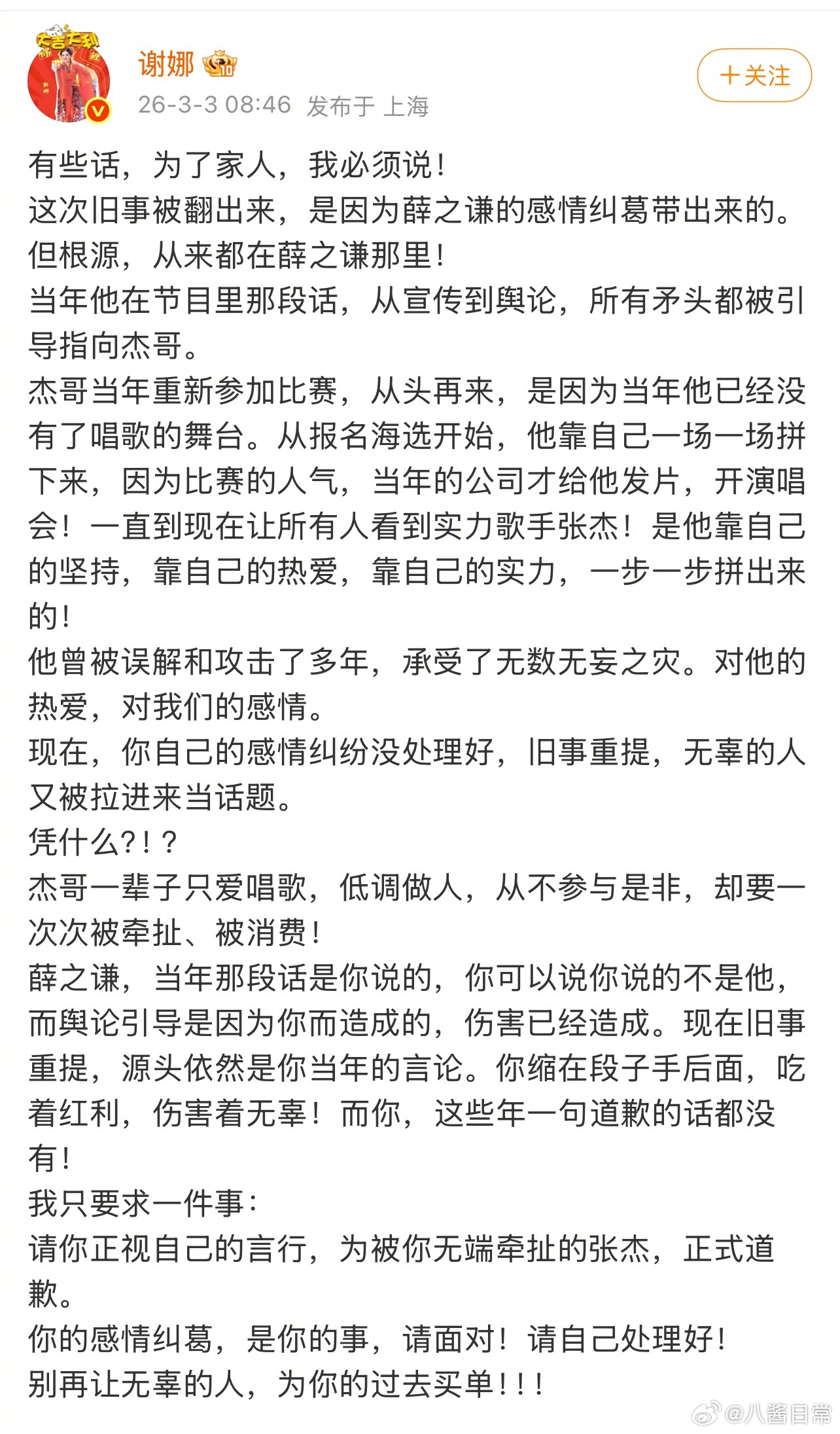张杰前女友 被出轨是事实谢娜喊话薛之谦