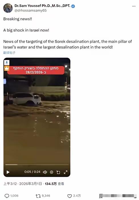 伊朗终于对以色列的海水淡化厂发动攻击了! 此次袭击造成了以色列国内巨大的惊恐,看来哈梅内伊的死,对伊朗人的刺激是巨大的。炸掉以色列所有的海水淡化装置,炸掉所有的电厂,攻击大城市里面所有的cbd高楼,这种攻击手段要比打军事目标更有效。 以色列国土三分之二都是沙漠,年均降水量连300毫米都不到,淡水资源极度匮乏。以色列全国70%到80%的饮用水,都要靠海水淡化厂供应。 本轮袭击隶属于伊朗伊斯兰革命卫队发起的真实承诺-4报复行动,伊朗动用法塔赫高超音速导弹与多型号弹道导弹,同时命中索雷科、阿什杜德、帕尔马奇姆三座核心海水淡化厂,全球规模领先的索雷科水厂核心反渗透膜系统与供电设备被彻底摧毁,直接造成以色列全国近45%的饮用水供应陷入中断。 袭击发生后不到两小时,特拉维夫、耶路撒冷等核心城市的超市与便利店出现饮用水抢购潮,货架上的瓶装水在半小时内被清空,部分社区提前接到停水通知,民众的恐慌情绪在社交平台快速蔓延。 海水淡化厂是以色列用科技对抗自然短板的核心成果,索雷科水厂单日可生产62.4万立方米淡水,承担全国20%的民用饮水供应,是中部城市群的生存命脉。 这些设施不属于传统军事目标,周边防空部署密度远低于空军基地与指挥中心,以色列铁穹、大卫弹弓等防空系统难以实现全覆盖防护,伊朗精准抓住这一防御盲区,用最低成本达成了最大的战略震慑效果。 专业工程机构给出评估报告,核心设备的修复周期至少需要30至60天,以色列没有足够的备用产能填补缺口,全国供水体系在短时间内无法恢复正常。 哈梅内伊在美以联合空袭中离世,让伊朗的反击行动彻底放弃克制。伊朗革命卫队的作战目标从军事设施转向民生根基,电厂、交通枢纽、CBD建筑群同步遭到打击,水电系统联动瘫痪,城市基本运转面临停摆风险。这样的打法绕开了正面军事对抗,直接将战争压力转移到普通民众身上,比摧毁坦克、导弹阵地更能动摇对方的社会根基,也更能倒逼以色列高层重新评估战事代价。 以色列官方紧急启动应急供水预案,启用加利利湖与地下含水层的储备水源,这些水源仅能满足核心城市72小时的基础用水需求,农业灌溉、工业生产用水被全面暂停。 南部沙漠地区的供水已经完全中断,当地居民只能依靠军方派发的应急用水维持生活,医院的透析、手术等医疗操作受到严重影响,部分慢性病患者面临断药断水的双重困境。 美国方面迅速做出回应,宣布向以色列紧急调运便携式净水设备与发电机组,同时增派防空力量进驻以色列境内。 外部援助只能缓解局部压力,无法解决海水淡化厂长期瘫痪的根本问题,以色列的水安全危机将持续发酵,成为悬在全国民众头上的利剑。 现代战争的形态早已发生改变,精准打击关键民生基础设施,成为弱势方对抗强势力量的常用手段。 伊朗没有选择与以色列的防空系统硬拼,而是直击对方无法替代、无法隐藏、无法快速修复的生存命脉,这种不对称作战思路,彻底打破了以色列本土绝对安全的固有认知。 冲突升级带来的伤害最终由普通民众承担,停水断电的生活、物资短缺的焦虑、战火蔓延的恐惧,正在吞噬中东地区本就脆弱的和平希望。 针对民生设施的攻击不断突破战争底线,地区局势已经走向全面失控的边缘,没有任何一方能在持续的对抗中全身而退。 战争从来没有赢家,被摧毁的不仅是厂房与设备,还有无数家庭的安稳生活,水资源、电力这些基础生存资源,不该成为地缘博弈的牺牲品。 各位读者你们怎么看?欢迎在评论区讨论。