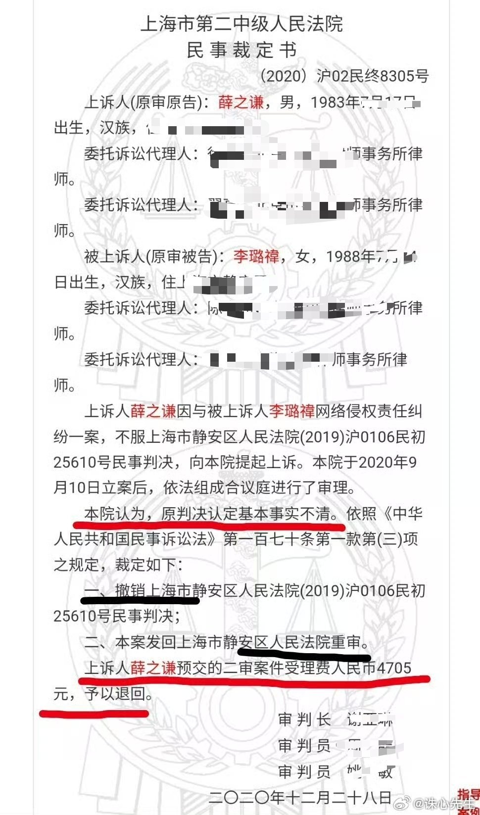 法院判决如下,薛之谦、李雨桐(李璐禕)相关信息系公开信息,不存在隐私问题,请微博不要再屏蔽了。