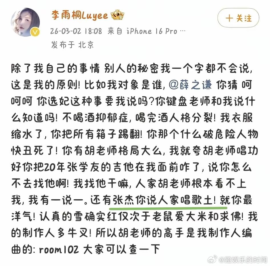 谢娜,终究还是为张杰站了出来!就因为当年和包文婧的一段旧事,她被议论了好几年,怎么澄清都没用。本想着这事慢慢就淡了,可张杰又被旧事重提。薛之谦当年在节目里说,“不会找比自己红的女朋友来辅佐自己”,这话被反复拿来对准张杰,难听的议论,跟了他近十年。本来以为这事就这么过去了,结果,就在3月2日,薛之谦的前女友李雨桐在社交平台公开发声时,顺带提到他私下说张杰唱歌土。谢娜从前在镜头前,总是嘻嘻哈哈,一副轻松开朗的样子。可这一次,她选择坚定地站了出来。从不是人变了,而是牵扯到家人,谁都没法轻易退让。平日里总把温暖带给别人的人,心里也有拼了命要守护的软肋。对于谢娜这次的公开发声,大家怎么看呢?
