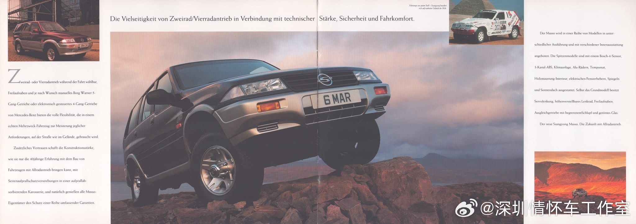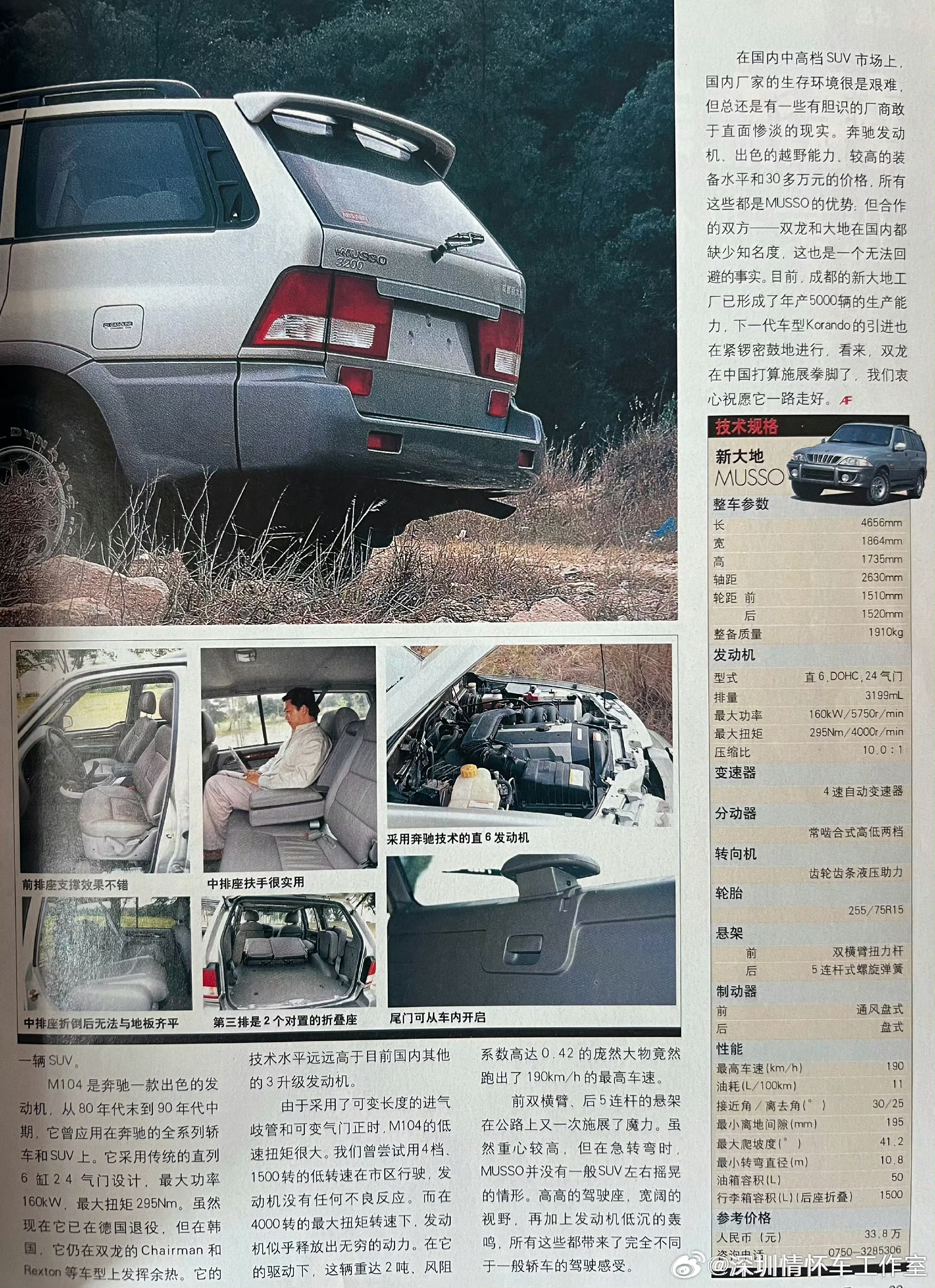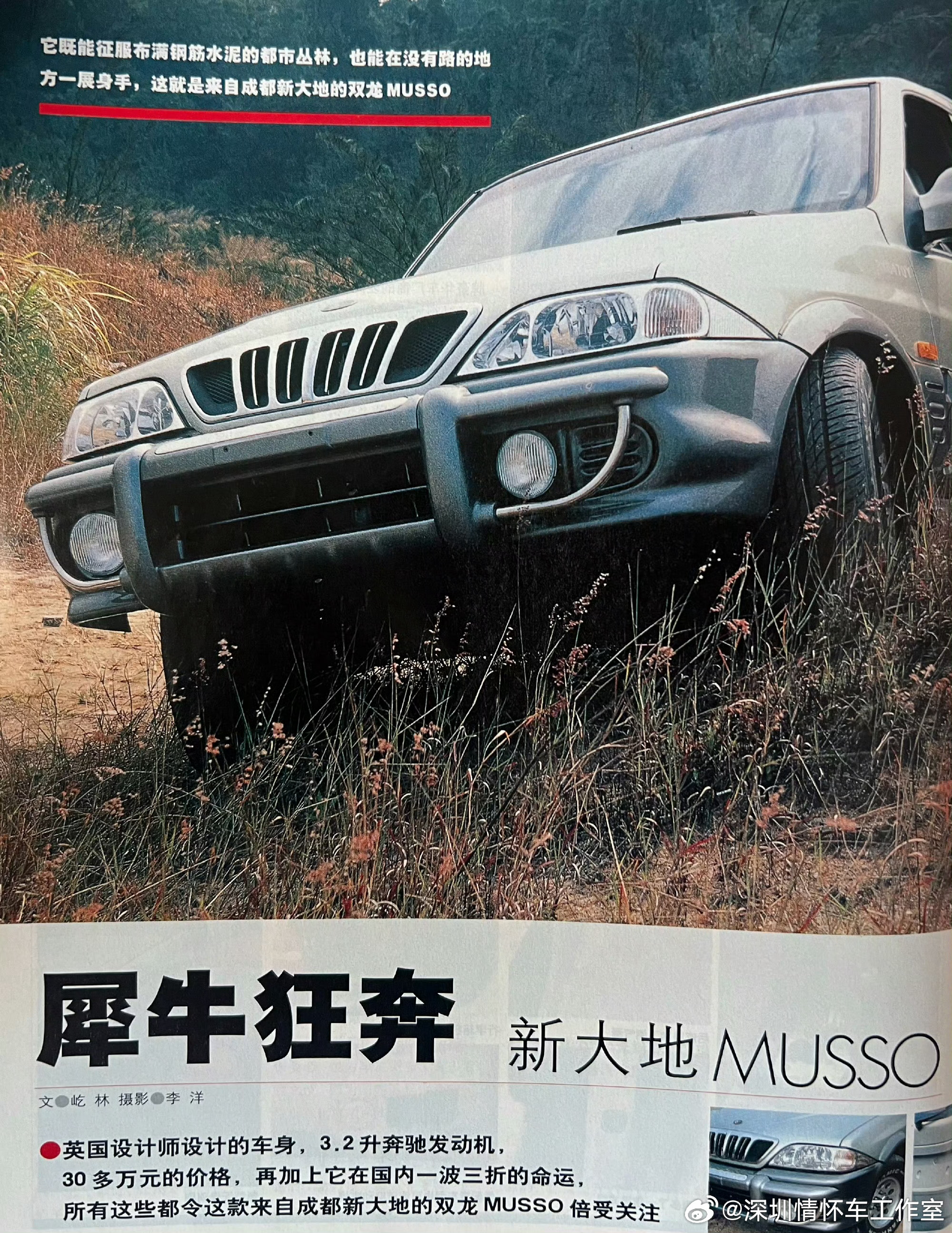 曾经,成都新大地组装的大地Musso(魔兽/犀牛),原型是韩国双龙Musso(犀牛)。 1993年韩国双龙推出,SsangYong Musso FJ,英国设计师Ken Greenley设计,双龙与奔驰合作,搭载奔驰2.3L四缸/3.2L直六发动机、全时四驱、TOD扭力分配,曾征战达喀尔,是90年代韩系高端硬派SUV代表。1998年成都大地汽车与顺德日新合资成立成都新大地汽车,1999–2001年新大地与西藏藏羚汽车合作,以藏羚牌名义小批量组装双龙Musso,仅西南销售; 2001年底:获国家公告,正式以大地Musso(RX6470Y/RX6471Y)全国上市,2004年:改款更名大地魔兽,换大宇风格前脸;2005年:双龙被上汽收购,合作终止,大地Musso停产。2001–2005年生产,总产量约3000–5000台,是早期国产高端硬派SUV的小众代表。