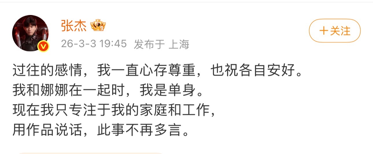 张杰回应张杰发文回应了:和谢娜在一起时是单身。对过往的感情心存尊重,祝各自安好。