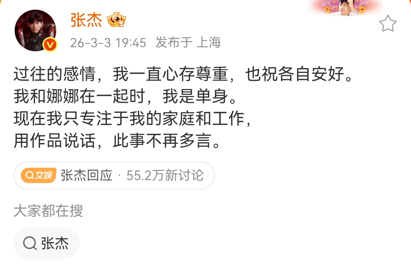 张杰回应 能感受到张杰这话说的是很有底气的,喜欢他很多年,正直纯洁,勤奋努力。
