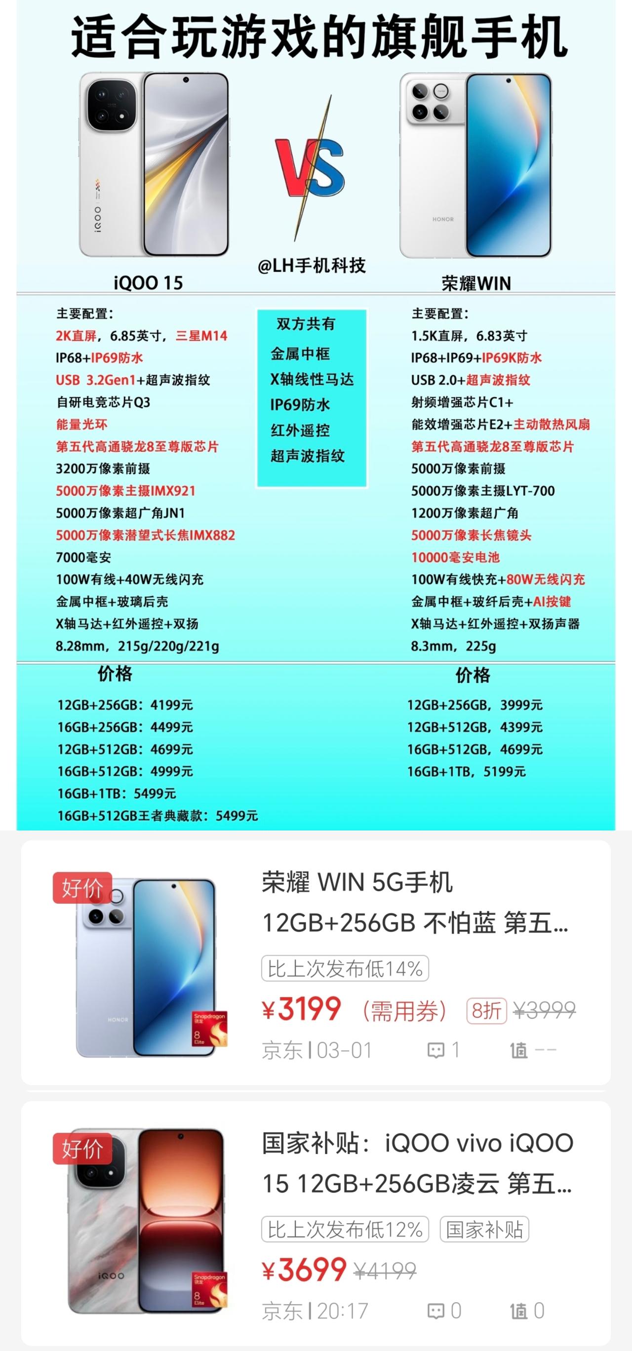 荣耀这操作真是让人惊掉下巴[捂脸]原本配置互有长短的产品,直接被荣耀终结比赛,这下iQOO傻眼了吧[捂脸] 可以说iQOO是今年难得的2K屏性能旗舰,玩游戏画质更细腻。不过荣耀WIN也不是等闲之辈,超高屏幕刷新率玩游戏很带劲,重要的是,荣耀WIN的续航优势明显,如今还拉开了价格差距,这下iQOO 15只能无奈低头了吧🤷