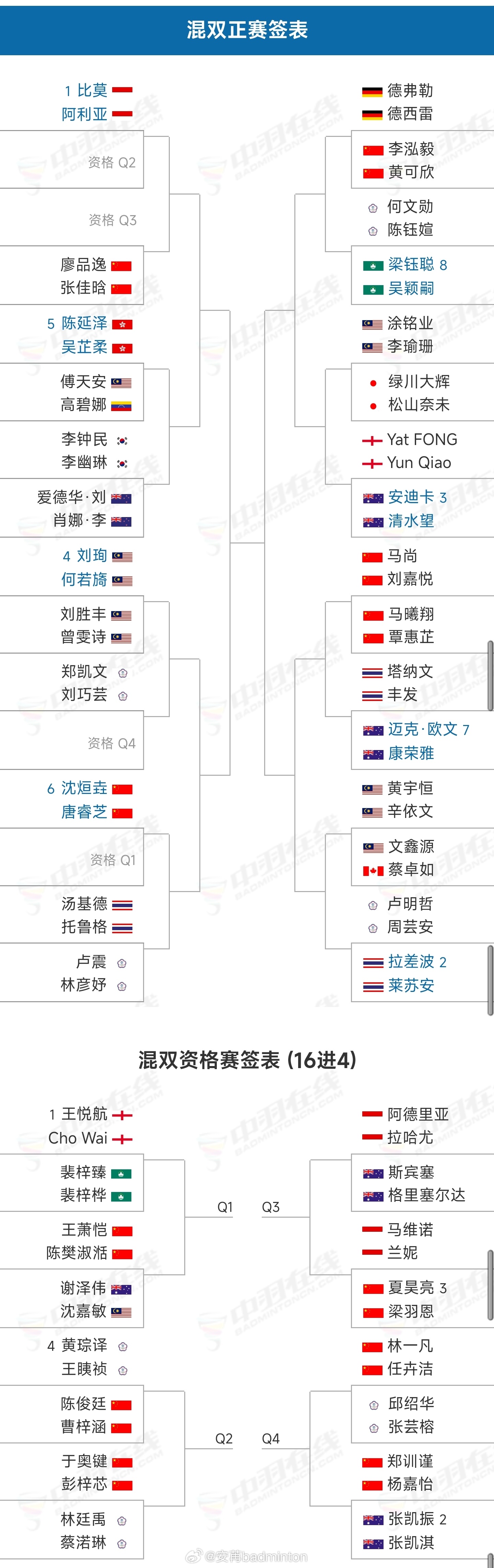 ★混双(图5)沈烜垚/唐睿芝🇨🇳 vs Q1李泓毅/黄可欣🇨🇳 vs 德弗勒/德西雷🇩🇪马曦翔/覃惠芷🇨🇳 vs 马尚/刘嘉悦🇨🇳廖品逸/张佳晗🇨🇳 vs Q3资格赛:Q1:王萧恺/陈樊淑湉🇨🇳 vs 谢泽伟🇦🇺/沈嘉敏🇲🇾Q2:于奥键/彭梓芯🇨🇳 vs 林廷禹/蔡渃琳ᴛᴘᴇQ2:陈俊廷/曹梓涵🇨🇳 vs 黄琮译/王眱祯ᴛᴘᴇQ3:夏昊亮/梁羽恩🇨🇳 vs 马维诺/兰妮🇮🇩Q4:郑训谨/杨嘉怡🇨🇳 vs 张凯振/张凯琪🇦🇺Q4:林一凡/任卉洁🇨🇳 vs 邱邵华/张芸榕ᴛᴘᴇ