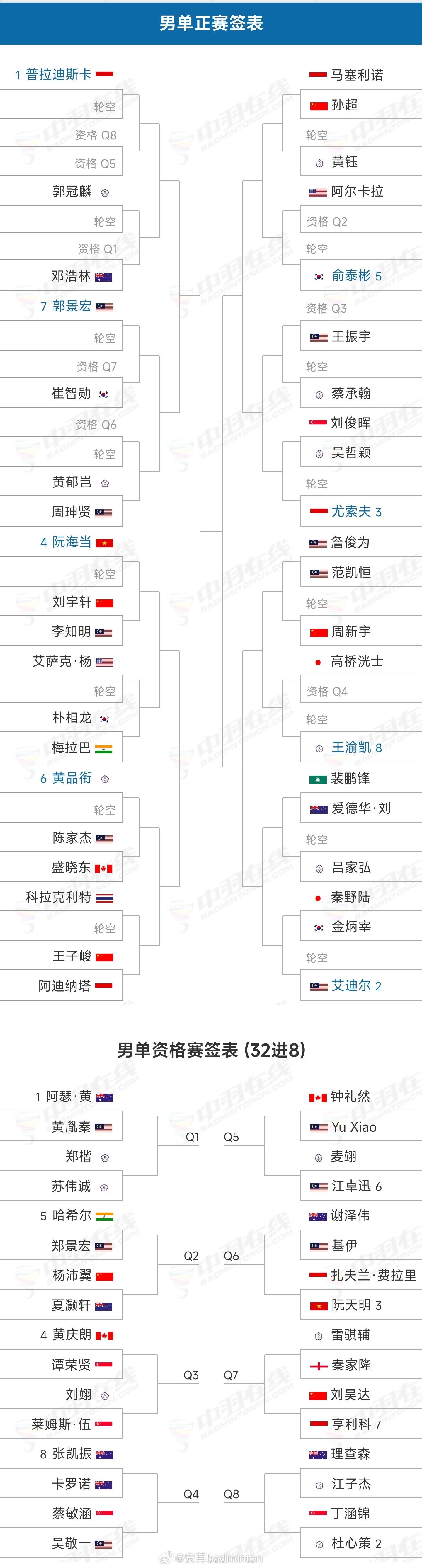 国羽🇨🇳首轮对阵如下★男单(图1)周新宇🇨🇳 轮空王子峻🇨🇳 vs 阿迪纳塔🇮🇩孙超🇨🇳 vs 马塞利诺🇮🇩刘宇轩🇨🇳 vs 李知明🇲🇾资格赛:Q2:杨沛翼🇨🇳 vs 夏灏轩🇳🇿Q7:刘昊达🇨🇳 vs 亨利科🇮🇩