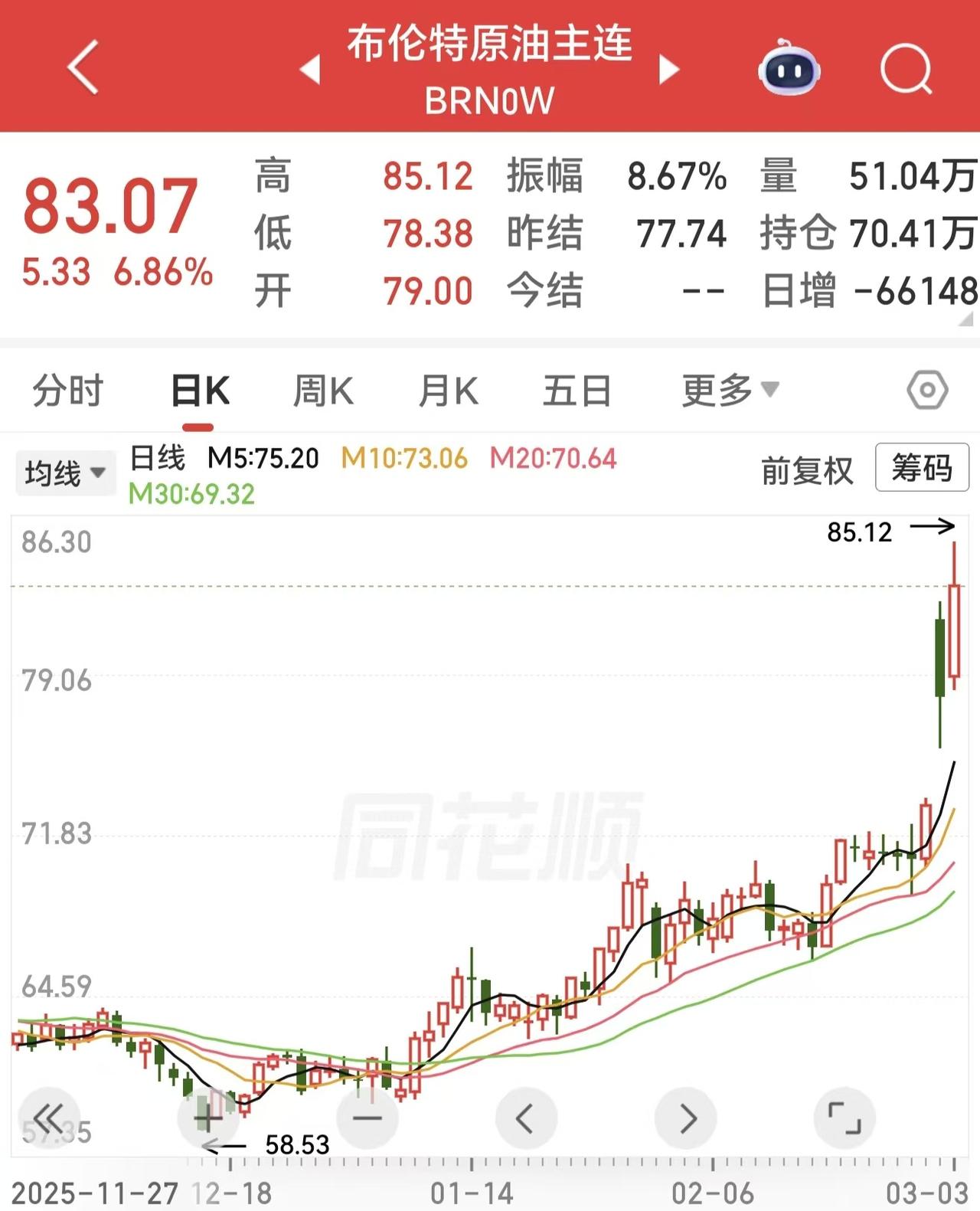 重大利好!明天大A油气板块继续独乐乐? 刚刚原油期货暴涨,其中布伦特原油一度直接大涨突破85美元每桶,创2024年7月以来的一个新高,涨幅一度超过9%! 原油期货的这么暴涨,无疑凸显了中东局势的大大不确定性。 现在来看,局势根本没有缓和的迹象,而且两边的大杀招都没有出现。这说明暴风雨还在后面。 一旦局势再次失控,原油价格有没有可能直接突破130美元每桶? 我想答案是非常有可能的,2022年俄乌战争爆发的时候,油价就突破过130美元。而现在中东更是全球的石化能源集中地,只有这里堵了,这比俄乌战争时的影响大多了。 现在原油价格这么暴涨,明天A股的油气开采板块又得独乐乐了吗?