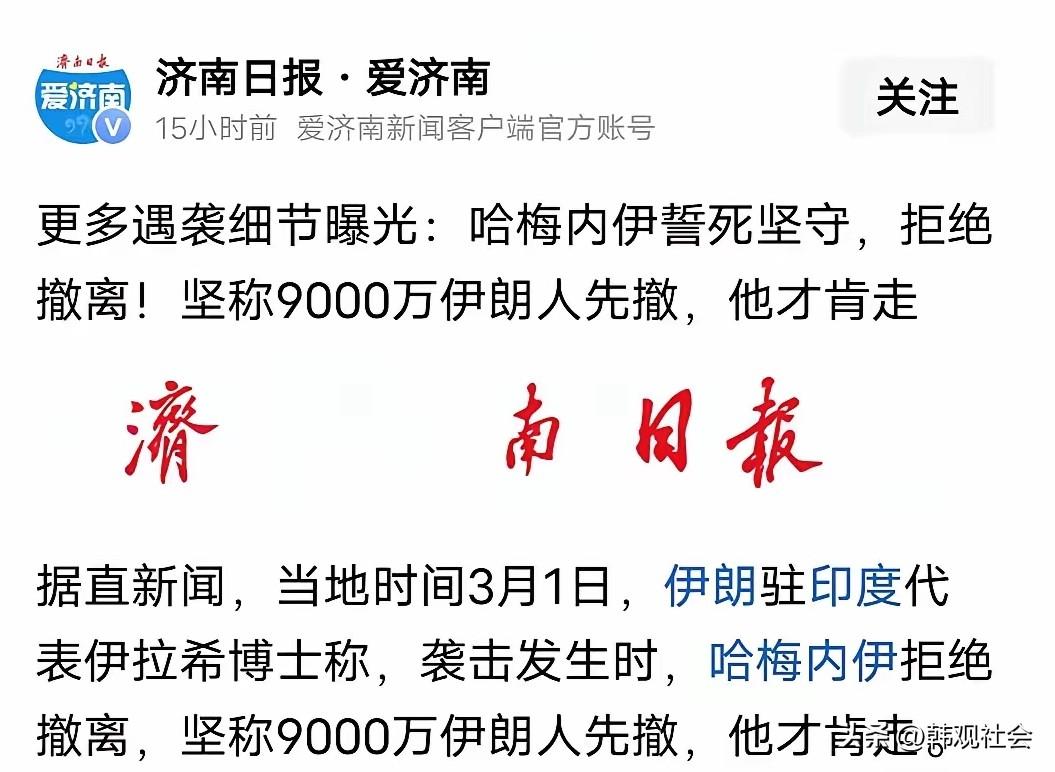 崇高的理想,伟大的信仰!群众不走,他不走;群众不撤,他坚决不撤!袭击发生时,哈梅内伊誓死坚守,坚决不撤! 《济南日报.爱济南》援引直新闻的消息,3月1日,伊朗驻印度代表伊拉希博士称,美国和以色列两国对伊朗发动袭击时,伊朗最高领袖哈梅内伊完全可以及时撤离。但是,他自己不撤,坚持让9000万伊朗人民先撤!