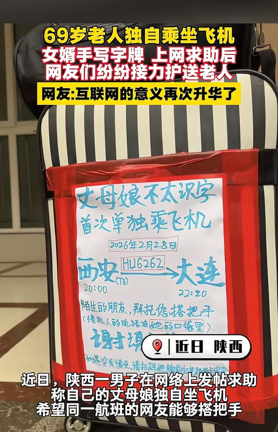 机场里,小伙子给丈母娘送行, 老人的行李箱上贴着一张纯手工写的大海报,上面写着: “丈母娘从西安飞大连,第一次单独坐飞机,不太认识字,陌生的朋友受累搭把手。” 机场这一幕,属实给我看暖了。 连登机口、座位号都标的明明白白。 旁边大姐瞧见,马上应下,说跟老人同班机,下机包送到出口,还说自己也有过类似经历。 老太太笑得眼睛都眯缝了,直夸女婿在家教了半个月系安全带。安检员看到海报,都主动带老人走优先通道。