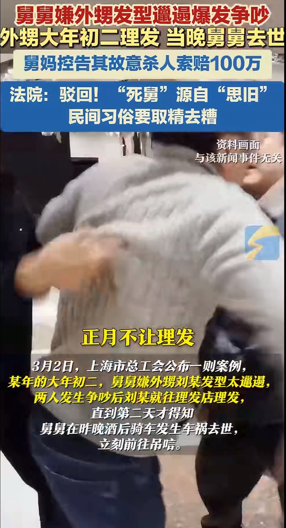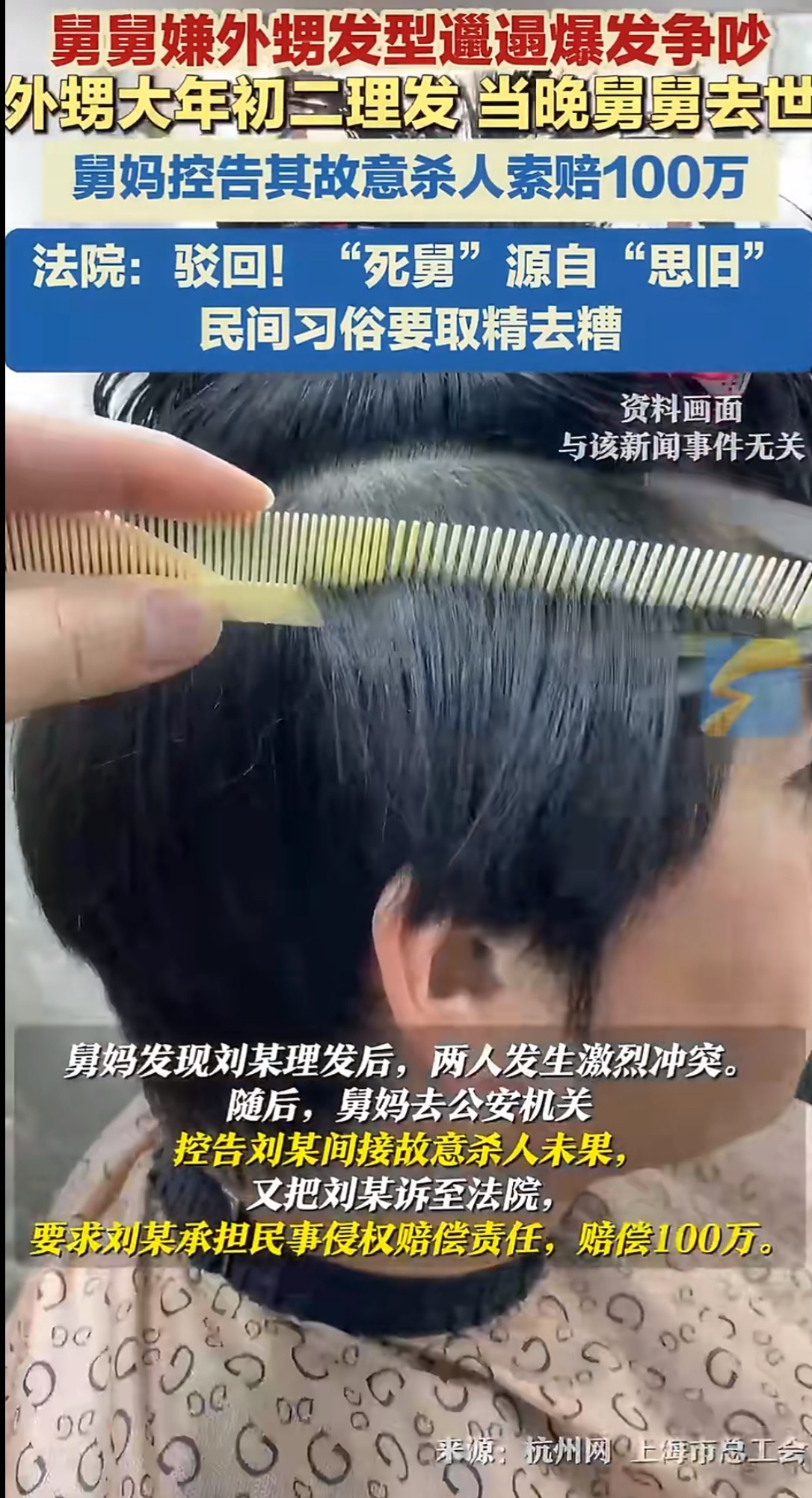 舅舅去世舅妈向正月理发外甥索赔百万舅舅自己觉得外甥“邋遢”,吵完了外甥去理发,结果舅舅自己晚上喝酒出车祸,从头到尾都没有外甥的事啊,怎么能让舅妈找外甥索赔百万?