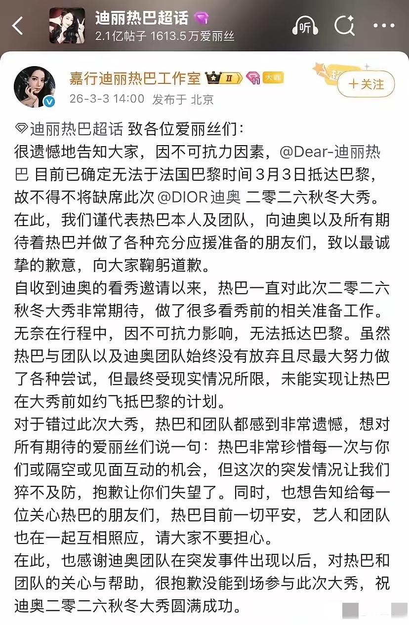 迪丽热巴因迪拜机场关闭,已滞留当地三天。受中东局势影响,她无法前往巴黎参加品牌活动,面临合约风险。其团队人员已先行抵达法国,而她因转机航班受阻,独自留在迪拜。目前她安全无恙,正等待航班恢复以便回国。此外,弦子夫妇、陈浩民夫妇及周雨彤等人也在迪拜滞留,均平安。愿所有同胞早日顺利归国。