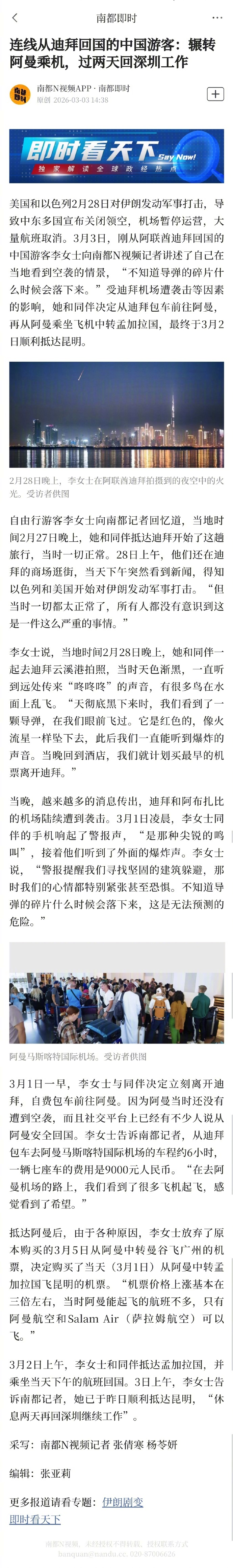 #中国女游客花9000块包车撤离迪拜#【连线从迪拜回国的中国游客:辗转阿曼乘机,过两天回深圳工作】#阿曼中转回中国机票涨价三倍#美国和以色列2月28日对伊朗发动军事打击,导致中东多国宣布关闭领空,机场暂停运营,大量航班取消。3月3日,刚从阿联酋迪拜回国的中国游客李女士向南都N视频记者讲述了自己在当地看到空袭的情景,“不知道导弹的碎片什么时候会落下来。”受迪拜机场遭袭击等因素的影响,她和同伴决定从迪拜包车前往阿曼,再从阿曼乘坐飞机中转孟加拉国,最终于3月2日顺利抵达昆明。