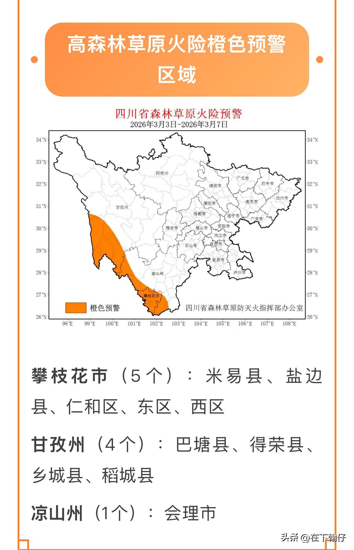 四川省森防指办公室今日(3月3日)发布高森林草原火险橙色预警。本次预警时间从3月3日持续至7日,涉及3个市州的10个县级行政区: · 攀枝花市(5个):米易县、盐边县、仁和区、东区、西区 · 甘孜州(4个):巴塘县、得荣县、乡城县、稻城县 · 凉山州(1个):会理市 ⚠️ 为何如此危险? · 极端干旱:部分地区已连续70多天无有效降雨,气象干旱持续。什么概念?通常来说,一个地区连续10-15天无有效降水就进入气象干旱,20天以上就属于严重干旱。70多天——这意味着地表水分早已蒸发殆尽,土壤干裂,草木从根系到叶片都失去了水分。 四川省林草部门的监测数据显示,当前这些区域的森林草原火险等级持续维持在高度危险级别,林下可燃物载量远超临界值。换句话说,地上铺满了“火药”,只等一个火星。 · 极易燃烧:地表干裂、草木枯黄,林下可燃物大量堆积,午后风力较大,起火后蔓延极快。 🛡️ 已采取的防控措施 目前相关地区已启动二级响应措施,包括: · 严格火源管控:发布禁火令,严禁一切野外用火,护林员全员上岗巡护。 · 隐患排查:重点清理输配电线路隐患,遇大风果断拉闸断电。 · 应急准备:地方扑火队伍靠前驻防、带装巡护,并适时开展人工增雨和洒水增湿作业。 这一带的防火不仅关系到当地安全,也牵动着整个长江上游的生态屏障。 我们能做什么? 对于身处预警区域的居民和游客,有三件事必须牢记: 第一,绝不野外用火。 不要以为“我就烧个垃圾”“我就烤个红薯”没事。此时此刻,任何形式的野外用火都是对生命的漠视。祭祀改用鲜花,吸烟去指定的室内场所,农耕绝对不烧荒。 第二,发现异常立即报告。 如果看到冒烟、闻到焦糊味,第一时间拨打12119森林火警电话。早一分钟报告,就可能少烧一片山。 第三,配合管控。 遇到防火检查点,主动配合登记,交出火种。暂时的不便,是为了保住我们共同的家园。