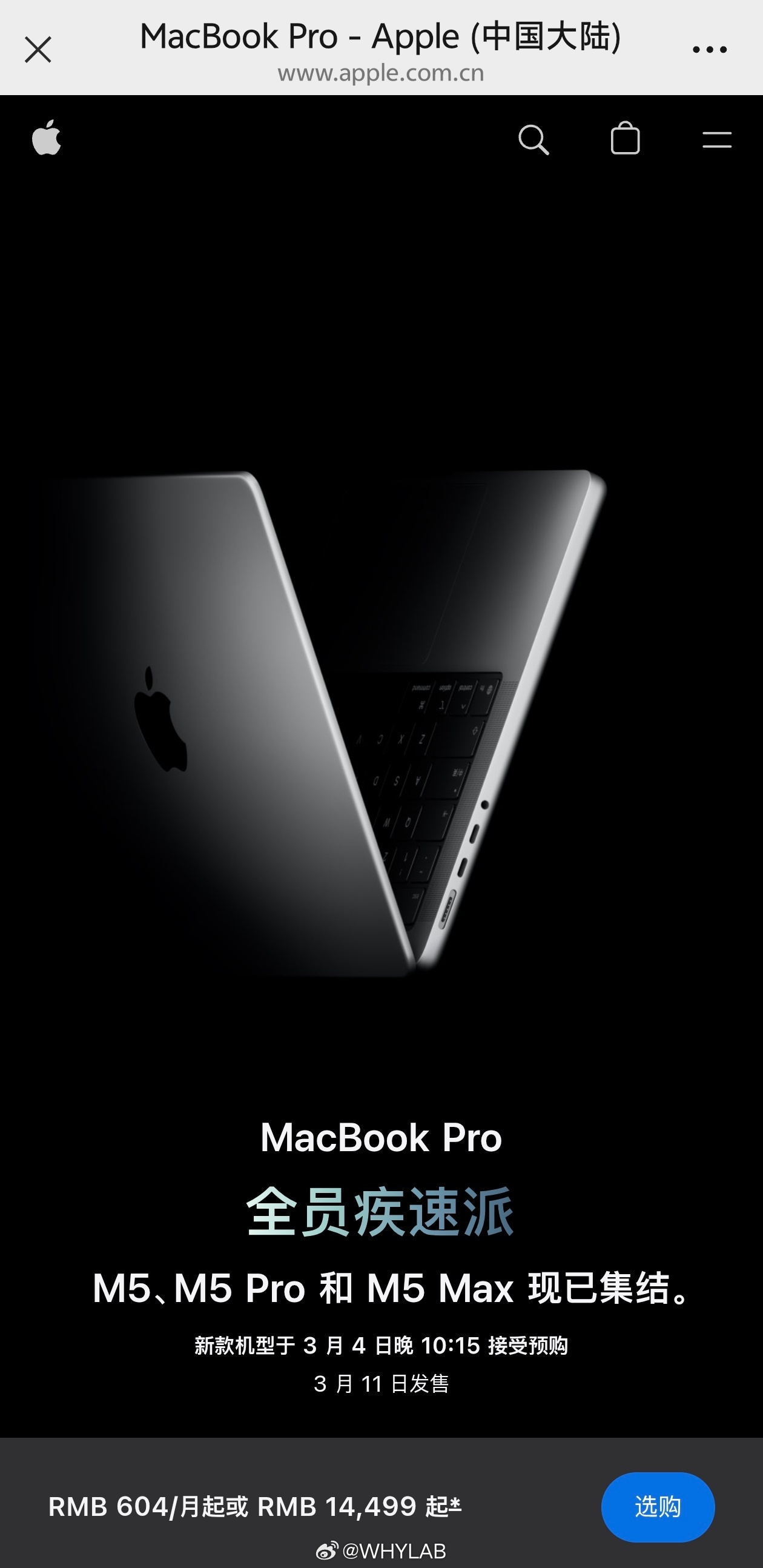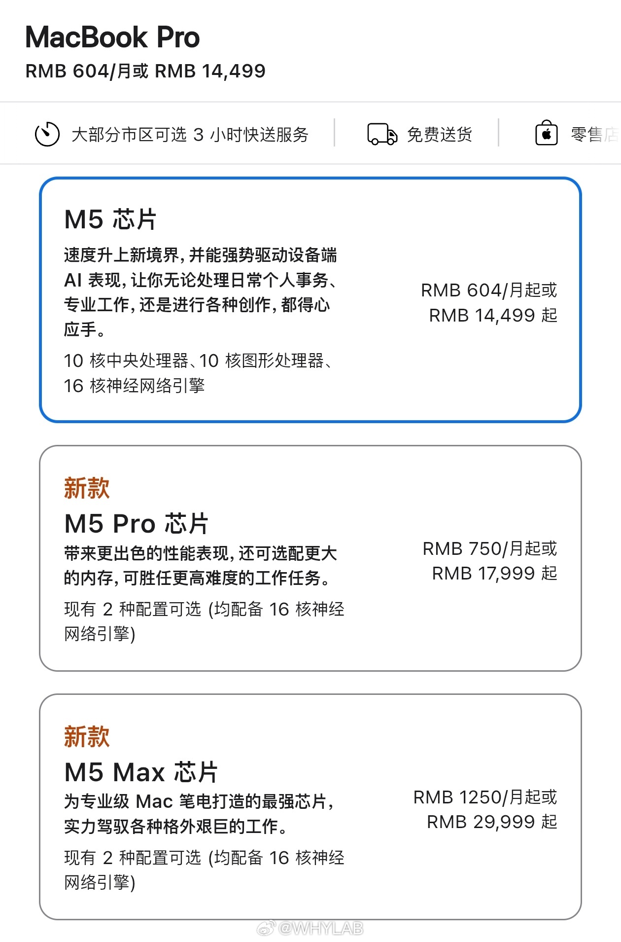M5 Pro、M5 Max 版 MacBook Pro 发布,主要升级点就是换芯,14 英寸版本 17999 起,16 英寸版本 29999 起。