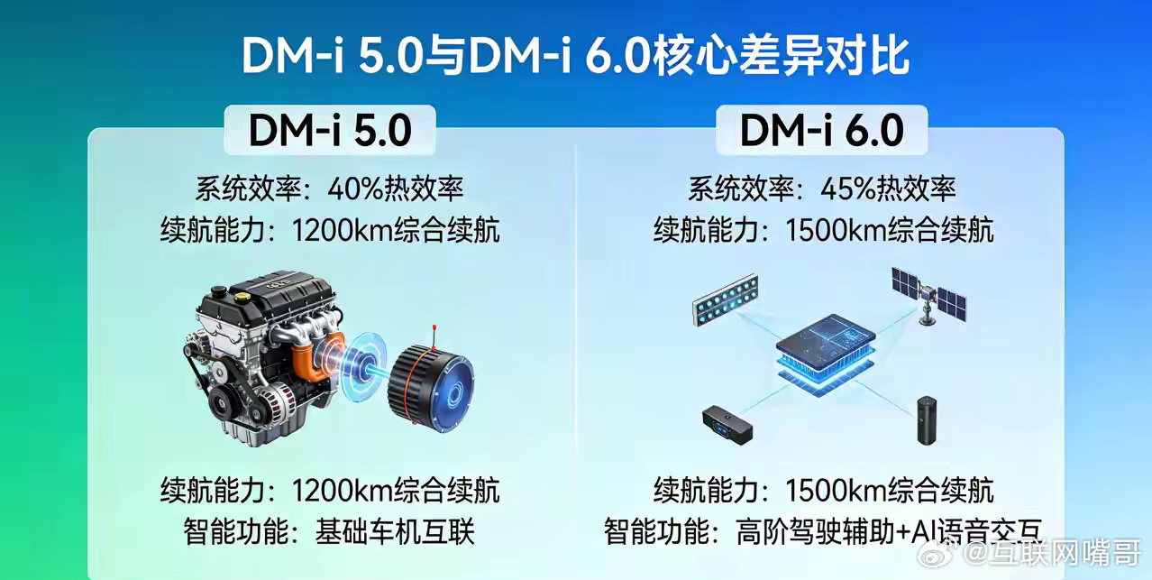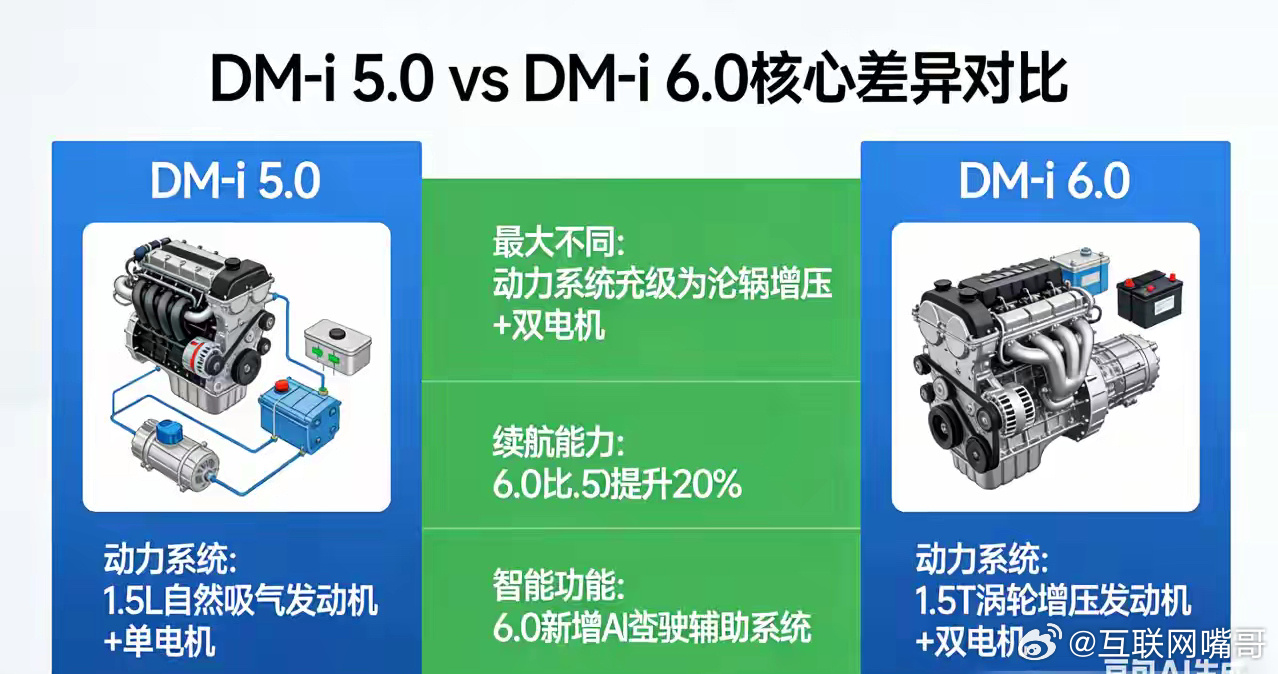DM-i 6.0 是 DM-i 5.0 的全面、跨越式升级,不是小改款,而是从高压平台、电机、发动机、电池、能量管理五大核心维度重做,优势非常明显,尤其在高速效率、亏电油耗、纯电续航、快充四大用户痛点上,提升是 “肉眼可见 + 体感可感” 的。一、核心区别(DM-i 5.0 vs DM-i 6.0)1. 高压平台与电控(最核心升级)DM-i 5.0:400V 平台,硅基 IGBT 电控DM-i 6.0:全域 900V 高压平台 + 碳化硅(SiC)电控能量损耗降低30%电驱系统综合效率突破97%油电切换更平顺、无感2. 驱动电机(技术代差)DM-i 5.0:传统永磁同步电机,高速弱磁效率低DM-i 6.0:可变磁通记忆电机低速强磁模式:扭矩提升30%,加速更猛高速弱磁模式:120km/h 巡航电耗降15%-20%,多跑约90km最高转速提升至25000-30000rpm,高速噪音更低3. 混动专用发动机(热效率天花板)DM-i 5.0:骁云 1.5L,热效率约43%-44%DM-i 6.0:骁云 1.5L,热效率46.5%-48%,压缩比15.5:1燃油利用率接近行业极限4. 电池与纯电续航(质变)DM-i 5.0:刀片电池,容量18-30kWh,纯电续航120-210kmDM-i 6.0:第二代半固态刀片电池,容量40-60kWh能量密度提升15.9%纯电续航主流250-300km,高配350km+支持16C 高倍率放电,低温性能更强5. 亏电油耗(最直观省钱)DM-i 5.0:CLTC 约3.8L/100kmDM-i 6.0:CLTC 低至1.8-2.4L/100km,比 5.0 再降10%+6. 快充速度(补能革命)DM-i 5.0:400V 快充,30%-80% 约30 分钟DM-i 6.0:900V 超快充充电 5 分钟,补能 400km20 分钟充至80%7. 能量管理与 NVHDM-i 5.0:基础智能能量管理DM-i 6.0:AI 智能能耗大脑,预判路况、坡度、车速,无感切换模式发动机介入震动、噪音大幅降低,静谧性接近纯电二、核心优势对比表表格维度DM-i 5.0DM-i 6.0提升幅度高压平台400V900V+SiC损耗 - 30%,效率 + 5%+驱动电机传统永磁可变磁通记忆电机高速电耗 - 20%,续航 + 90km发动机热效率43%-44%46.5%-48%+3-4 个百分点纯电续航120-210km250-350km+100%+亏电油耗~3.8L/100km1.8-2.4L/100km-35%+快充速度30 分钟 (30%-80%)5 分钟补 400km速度 ×5+综合续航~1300km2000km++50%+三、优势是否明显?(结论)优势极其明显,是代际级提升,体现在:高速不再 “掉电快”:120km/h 巡航多跑约 90km,彻底解决高速续航焦虑。亏电更省、长途更省:亏电油耗从 3.8L 降至 2.4L 以内,一年 2 万公里省约2000 元油费。纯电当电车开:250-300km 纯电续航,日常通勤一周一充,短途零油耗。快充像加油:5 分钟补能 400km,长途补能无压力。动力与静谧双优:低速更猛、高速更静,驾乘质感接近纯电。一句话总结:DM-i 6.0 把 “省油、续航、快充、动力” 四大痛点一次性解决,是当前家用混动的最优解之一。