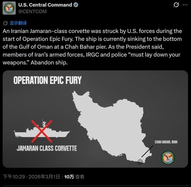 美军中央司令部还算是挺务实的,他们不贪功好喜,他们在击沉伊朗的伊朗“贾马兰“级舰艇时,对外发布击沉伊朗的护卫舰,而不是按伊朗官方宣称的“贾马兰”驱逐舰。驱逐舰与护卫舰是天壤之别,驱逐舰排水量在4000吨以上,护卫舰则是2000–4000吨。 美军中央司令部在对外发布战果时,确实表现得比较实在。2026年3月初的那次“史诗狂怒行动”里,美方直接把被击沉的伊朗贾马兰级舰艇归类为“corvette”,也就是小型护卫舰或者轻型护卫舰,而不是跟着伊朗那边一口咬定的“驱逐舰”。这个区别不是随便说说,国际海军分类里,吨位和任务能力才是硬指标。驱逐舰一般得4000吨往上走,能独立执行远洋护航、反潜、防空、多目标打击,属于主力舰种;护卫舰通常2000到4000吨,主要负责近海巡逻、护渔、反舰;再往下就是1400吨左右的这类,基本就是近岸防御、快速反应、有限反舰能力,国际上多叫corvette或者轻型护卫舰。 伊朗从2000年代开始自己造舰,贾马兰级(也叫穆杰级)是他们宣传的“骄傲”,2010年首舰下水服役,当时伊朗官方媒体大肆报道,说这是“国产驱逐舰”,排水量号称1500吨左右,装备了76毫米舰炮、C-802或Noor/Qader反舰导弹、短程防空导弹,还能搭载直升机。听起来挺唬人,但实际吨位就1400吨出头,满载也超不过1500吨,续航力和武器搭载量都有限,远达不到驱逐舰的标准。伊朗海军至今没有一艘真正意义上的4000吨级驱逐舰,他们把这类小型舰硬往驱逐舰上靠,更多是宣传需要和面子工程。 美军中央司令部这次发布声明时,没有跟着伊朗的说法走,而是老老实实按实际规格写“corvette”。这份声明来自官方渠道,措辞很克制,只说摧毁了一艘伊朗海军corvette,没有额外渲染战果,也没有把对手吹成“强大驱逐舰”来显得自己多牛。这样的处理方式在美军体系里其实挺常见,尤其是中央司令部这几年,指挥官换了几任,但报告风格都偏向保守、基于事实。像库里拉将军在任期间,就反复强调情报要准、分类要严谨,避免因为夸大战果被对手反过来利用,或者让盟友觉得不靠谱。 伊朗海军的水面作战力量本来就弱,主力还是快艇群和小吨位舰艇,贾马兰级算是他们少数几艘相对现代化的水面舰。被击沉后,伊朗官方很快出来回应,称损失“可控”,但实际上这艘舰对他们在波斯湾和阿曼湾的部署影响不小。霍尔木兹海峡附近本来就敏感,这类舰艇本来用来威慑、巡逻、伴随油轮,现在少了一艘,等于少了一个能携带反舰导弹的平台。美方后续声明里提到,这次行动整体上削弱了伊朗水面舰队的区域拒止能力,但也没把单艘舰的损失吹成决定性打击。 从成本和能力对比看,一艘标准驱逐舰的造价和维护费用能顶好几艘1400吨级舰,伊朗把有限资源投到这类小型舰上,还非要叫驱逐舰,其实暴露了他们海军现代化的尴尬处境。没有成熟的舰载系统集成能力、发动机技术、雷达和电子战装备都依赖进口或逆向,造出来的东西吨位上不去,性能也上不去。美军这边选择不跟着喊“驱逐舰”,某种程度上也是在戳破这种宣传泡沫,用最朴实的分类把事情说清楚。 两边信息发布风格对比鲜明,一边实事求是,一边硬着头皮包装。说到底,海军实力差距摆在那,吨位、吨位、还是吨位,1400吨硬叫4000吨级,终究是自欺欺人。美方这次没配合演戏,也算给外界一个相对客观的参照。
