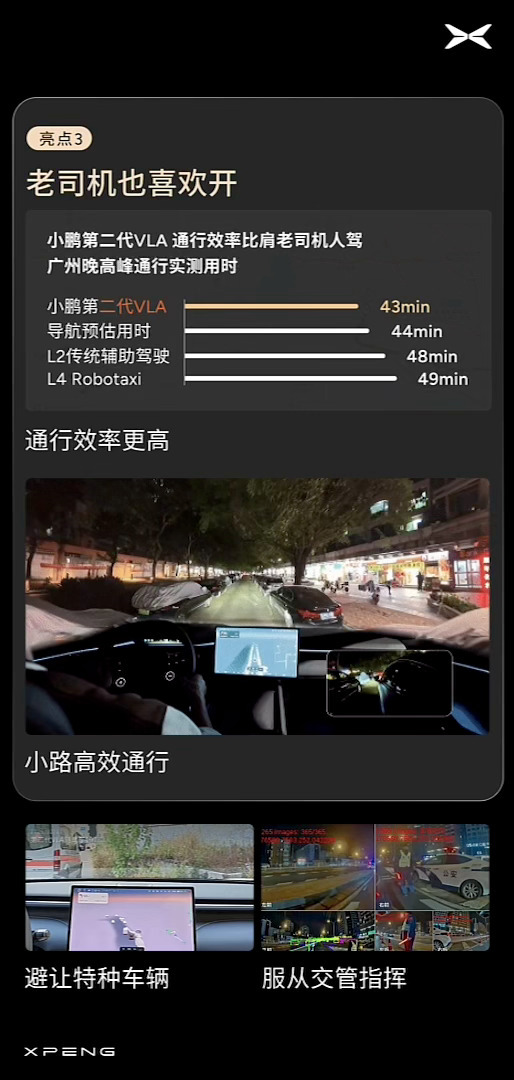 感觉小鹏第二代VLA,要打开「完全自动驾驶」时代的大门了小鹏智驾负责人称拉开差距的时刻到了小鹏第二代VLA妈妈都爱开的国民智驾 通行效率比传统 L2、Robotaxi 快 30%,耗时无限接近导航模拟时间;高峰变道果断不被加塞,城中村小路也能高效平稳通过;智能避让救护车,看懂交警手势,查酒驾场景自动减速配合,涌现能力拉满 西安