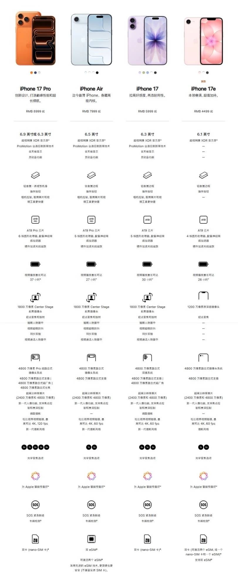 另外,与上代相比,iPhone 17e有趣的一点是,其支持双卡,即一个nano-SIM卡和一个eSIM,或2个eSIM。