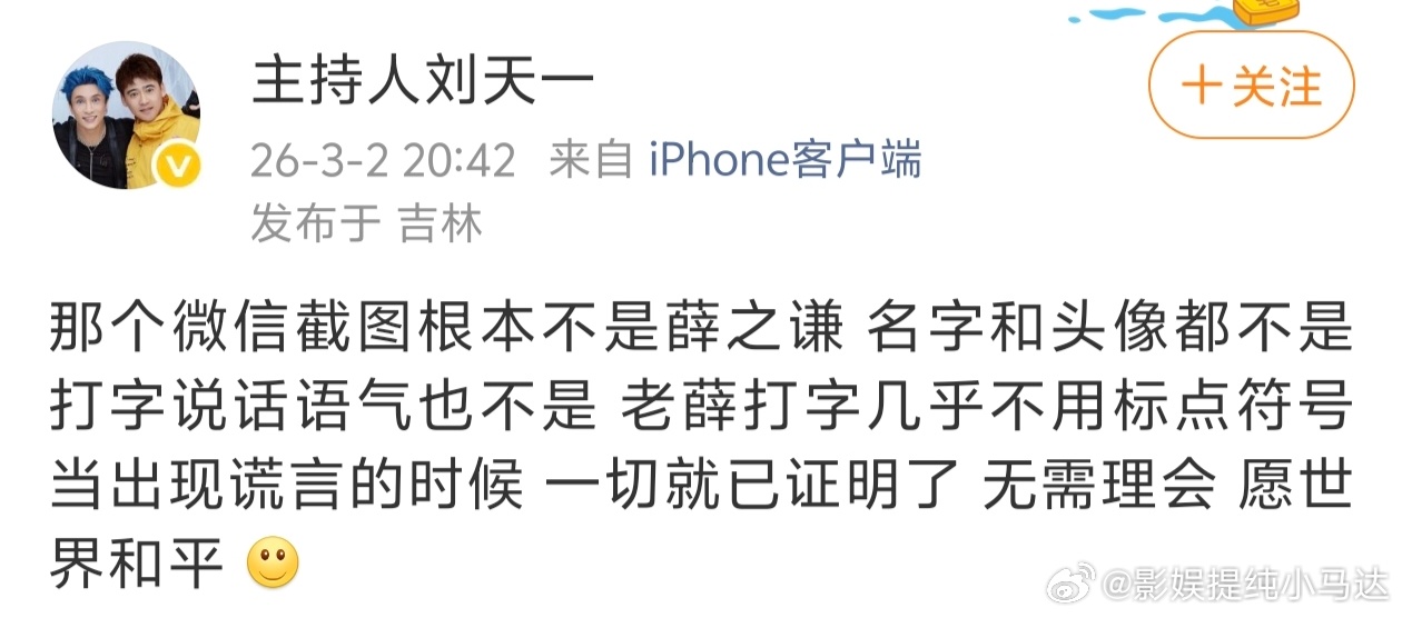 一名叫做刘天一的主持人发声力挺薛之谦:那个微信截图根本不是薛之谦 名字和头像都不是 打字说话语气也不是 老薛打字几乎不用标点符号 当出现谎言的时候 一切就已证明了 无需理会 愿世界和平