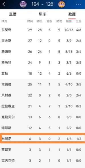 湖人新星布朗尼真是让人眼前一亮!在昨天湖人主场以128:104轻取国王的比赛中,布朗尼在短短的6分钟里打出了让人眼前一亮的表现。 北京时间3月2日,湖人坐镇主场迎来国王的挑战,整场比赛湖人几乎全程掌控节奏,最终以128-104轻松拿下胜利,喜迎两连胜,战绩来到36胜24负,继续稳固西部第六的位置,而国王则依旧深陷西部垫底。 这场比赛从一开始就没什么悬念,湖人首节就轰下36分,只让国王拿到18分,一下子建立起18分的领先优势。 后续虽然国王偶尔有反扑势头,但湖人总能及时稳住局面,分差最大时一度达到30分,第四节后半段彻底进入垃圾时间,主力球员纷纷下场休息,也给了替补席更多表现机会。 就是在这样的垃圾时间里,布朗尼迎来了登场机会,全场替补出战6分钟,交出了一份干净利落的数据单。 他投篮3中1,其中三分球2中1,拿到3分的同时还送出2次助攻,最难得的是,这6分钟里他没有出现任何失误,也没有吃到一次犯规,在有限的时间里展现出了不错的稳定性。 这么说吧,垃圾时间的出场看似含金量不高,但能在NBA级别的赛场做到零失误零犯规,本身就不容易,尤其是对于还在成长中的布朗尼来说,这份沉稳远超同龄新秀。 他的那个三分球,是在左侧底角接到传球后,从容调整出手,空心入网,看得出来投篮节奏很稳,不是盲目出手。 两次助攻也很有灵性,都是简单的持球分球,精准找到空位队友,展现了不错的传球视野。 结合布朗尼本赛季的表现来看,他的进步其实很明显,本赛季他的三分命中率已经提升到41.4%,远比新秀赛季的28.1%高出不少,这场比赛的三分命中也不是偶然。 之前他在发展联盟和偶尔的NBA出场中,也多次展现出稳定的三分能力,52次三分出手命中21次,40.4%的命中率,足以说明他在投篮上的努力没有白费。 很多人觉得布朗尼是靠父亲詹姆斯才有机会,但抛开标签来看,他在有限的出场时间里,从来没有浪费过机会。 这场6分钟的表现,没有失误和犯规,进攻端有三分,组织端有助攻,看得出来他在场上很专注,知道自己该做什么,不该做什么。 说白了,要是布朗尼能获得更稳定的上场时间,比如场均15分钟左右,他大概率能打出更有说服力的表现。 现在他缺少的就是持续的赛场历练,垃圾时间的几分钟,只能让他找找比赛感觉,没法完全展现自己的能力。 如果能在常规时间获得一些机会,适应比赛节奏,相信他能在进攻端贡献更多得分,组织端也能送出更多助攻。 当然,也不能过度期待,布朗尼目前还只是一名年轻的替补球员,还有很多需要提升的地方,比如身体对抗、防守细节等,这些都需要时间去打磨。 但这场比赛的6分钟,足以证明他不是只会“躺赢”,而是有实实在在的实力,正在用自己的表现一点点打脸质疑。 湖人这场大胜,东契奇的准三双和詹姆斯的稳定输出是关键,但布朗尼这样的年轻球员的成长,同样是球队的收获。 一支球队的长远发展,既需要核心球员扛大旗,也需要年轻球员慢慢成长,补充新鲜血液。 布朗尼的NBA之路才刚刚开始,这场6分钟的亮眼表现,只是他成长路上的一个小缩影。 相信只要他继续保持专注,不断打磨技术,未来一定能在湖人获得更多机会,打出属于自己的一片天。 以上都是个人观点,对此您有什么不同的看法,可以在评论区留言讨论!!!