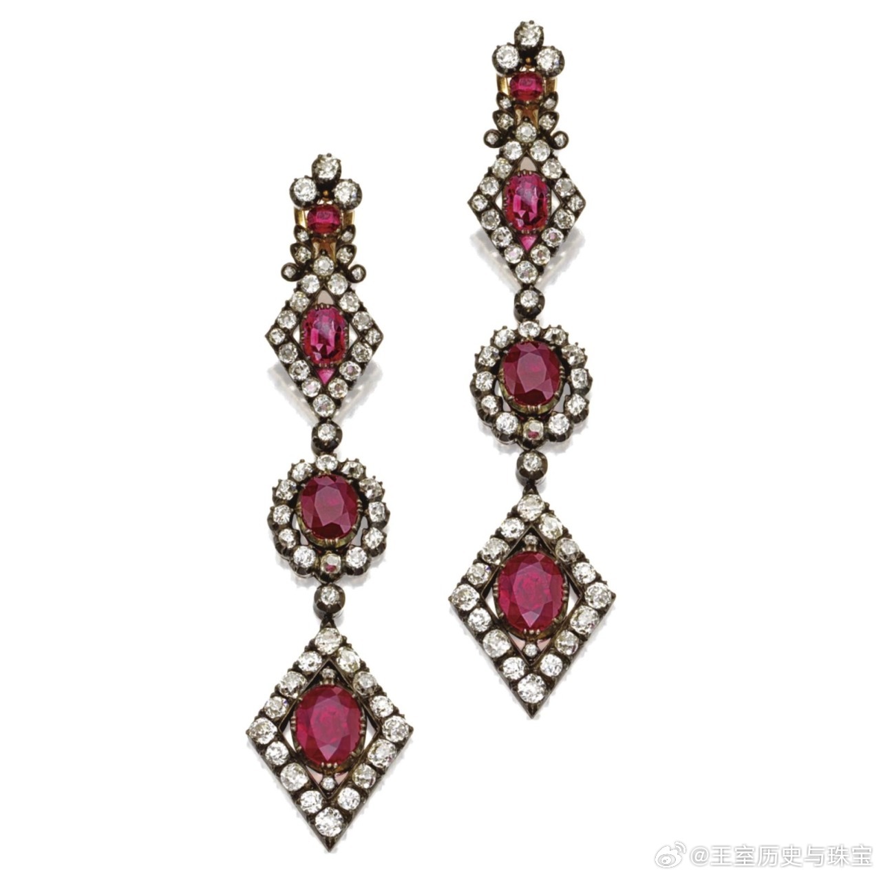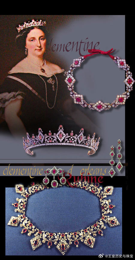 珠宝 Princess Clémentine’s Ruby Parure 法国奥尔良公主克莱门汀(法国国王路易·菲利普的幼女)的红宝石套装,是1843年克莱门汀与萨克森-科堡-哥达王子奥古斯特(英国阿尔伯特亲王的堂哥)结婚时,父亲路易·菲利普送给她的结婚礼物,大约1835年制造,整套珠宝包括王冠、项链、耳环和胸针,珠宝采用金银叠打材质,以垫形红宝石,玫瑰切钻石为主体,以镂空菱形图案,三叶草,四叶草为主要元素,完整又华丽的一套珠宝。