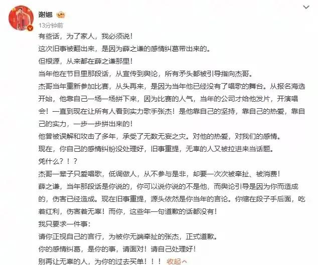 谢娜这会儿的心情,大概谁都能体会。好好的日子过着,突然被不相干的事搅得鸡犬不宁,换谁都得窝火。 事情本来跟张杰八竿子打不着,就因为早年一点捕风捉影的关联,被翻出来反复说。张杰踏踏实实唱歌这么多年,没招谁没惹谁,平白被拉进别人的恩怨里,换成谁都得急。谢娜站出来说话,不是冲动,是真忍不下去了——凭什么自家日子过得好好的,要被别人的烂摊子溅一身泥? 这事儿最让人膈应的是“无妄之灾”这四个字。张杰这些年在舞台上挣的每一分体面,都是靠嗓子一句句唱出来的,结果平白被扯进别人的感情纠葛里,连带着过往的努力都被质疑。谢娜护着的不只是老公,更是那份干干净净的心血,换做任何一个普通人,自家好好的日子被搅和,也得站出来说句公道话。 再看另一边,事情闹到这份上,总拖着也不是办法。该说清的说清,该道歉的道歉,躲着解决不了问题。毕竟牵连到旁人,尤其是无辜的人,拖着越久,泼出去的脏水越难收。网友眼睛亮,谁是谁非自有公论,但把不相干的人卷进来,总归不地道。 其实大家看的不只是热闹,更是个态度。是是非非摆到明面上,该承担的承担,该澄清的澄清,别让无辜的人跟着受牵连。谢娜这一步,看似刚,实则是在划清界限——我的生活干干净净,别来沾边。这种护着自家日子的劲儿,普通人都懂,谁还没遇过被莫名其妙的事缠上的时候?忍无可忍,自然无需再忍。 至于后续,其实很简单。把该了的恩怨了了,把不该牵连的人摘干净。舞台是舞台,生活是生活,拿作品说话的人,不该被这些乌七八糟的事绊住脚。观众心里有杆秤,谁踏踏实实做事,谁总惹麻烦,看得明明白白。 说到底,过日子就图个清净。你有你的纠葛,我过我的安稳,互不打扰最好。真要越过界了,谁也不会一直忍着。这次谢娜站出来,与其说是刚,不如说是普通人都会有的反应——护好自己的小日子,谁也别想随便糟践。