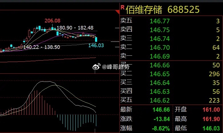 今天受大盘和芯片板块大幅调整的影响,佰维存储股价大跌8.62%,股价自年内高点206元至今跌幅近三成。今天成交额近47亿元,换手率6.61%,说明很多资金参与,股性非常活跃。
