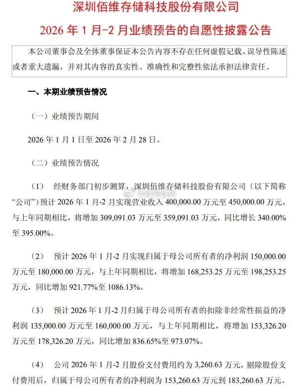 3月3日晚间,芯片龙头佰维存储公布业绩报告,预计今年1-2月营收40亿元至45亿元,同比大增340%至395%;净利润为15亿元至18亿元,同比扭亏为盈。业绩大增的主要原因是今年存储行业供不应求,公司受益显著。