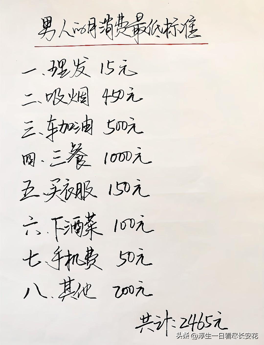 【“男人月消费2465元”火了:这张账单,藏着多少中年男人的委屈?】 网上一张“男人月消费最低标准”的手写账单火了:理发15元,抽烟450元,加油500元,三餐1000元……算下来每月2465元。评论区吵翻了:有人说“太惨了,活得不如狗”,也有人觉得“男人就该对自己狠一点”。可这张薄薄的纸背后,藏着多少中年男人不敢说出口的委屈? 先看看这账单多“扎心”:理发15元,大概是小区门口快剪的价格;买衣服150元,可能只够一件打折T恤;手机费50元,勉强够基础套餐。最“奢侈”的是450元的烟钱和100元的下酒菜——原来男人的“放松”,只能压缩在吞云吐雾和几碟小菜里。有网友晒出自己的账单:房贷车贷不算,孩子奶粉钱、父母医药费,哪样不要钱?这2465元,恐怕连塞牙缝都不够。 为什么这张账单能戳中人心?因为它照见了无数“隐形贫困人口”的真相:表面上有车有房,实际上每月工资刚到账就被各种账单瓜分;在外人看来“家庭支柱”,关起门来却连买件新衣服都要犹豫。心理学上的“情绪价值忽视”告诉我们,中年男人的压力往往被忽视——“你是男人,就该扛着”。可他们也是人,也会累,也需要被看见。 但换个角度想:这张账单真的是“最低标准”吗?有人不抽烟不喝酒,有人通勤靠地铁,消费本就是个人选择。真正该反思的,是我们对“男人”的刻板印象:好像他们必须赚钱养家,必须省吃俭用,必须把委屈咽进肚子里。其实,男人也可以偶尔“奢侈”,也可以说“我累了”,也可以和家人一起分担生活的压力。 说到底,账单只是数字,背后的生活才最真实。与其争论“2465元够不够”,不如多给身边的男人一点理解:他省吃俭用,可能是为了给孩子报补习班;他抽烟喝酒,可能是压力太大需要发泄。毕竟,一个家庭的幸福,从来不是靠某个人“委屈自己”撑起来的,而是靠一家人互相体谅。 你家的消费账单是谁在管?评论区聊聊,那些藏在数字背后的故事。