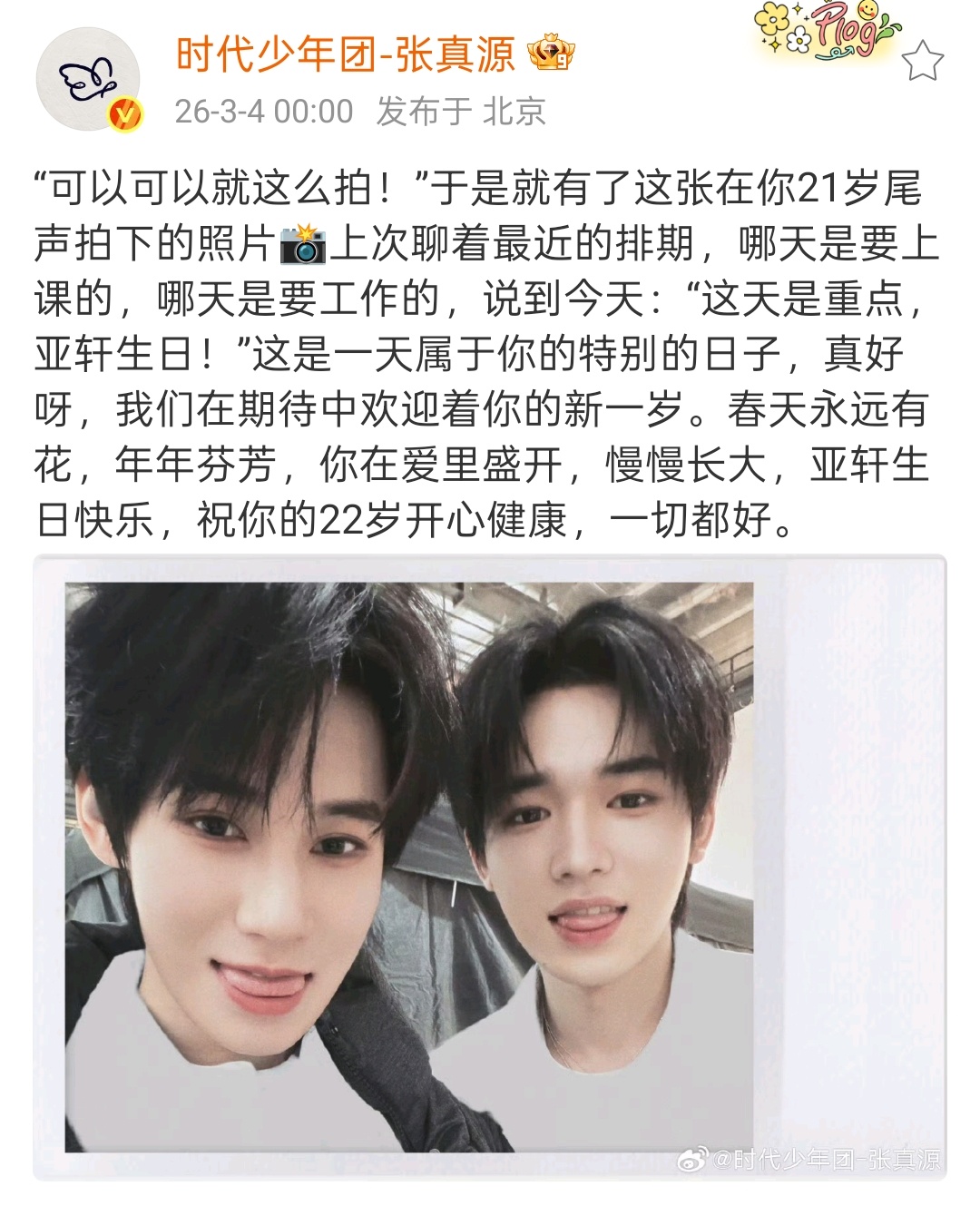 张真源宋亚轩吐舌照 张真源卡点晒吐舌卖萌照为宋亚轩庆生,希望“你在爱里盛开,慢慢长大,亚轩生日快乐,祝你的22岁开心健康,一切都好。”张真源让宋亚轩慢慢长大张真源祝宋亚轩22岁开心健康