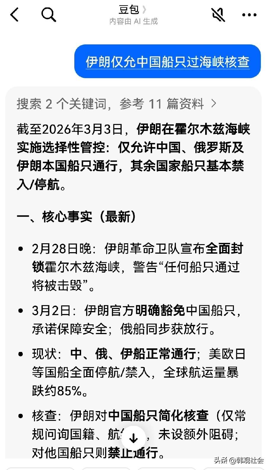 中国能源的好消息来了!3月3日,伊朗的一家官媒“阿拉伯通讯社”在社交媒体发布声明:伊朗仅允许中国船只通过霍尔木兹海峡。 这条消息是真的还是假的?如果消息属实,证明我们的能源安全有保障了!为了证实该条消息的真假,咱问问万能“豆包”吧,看看@豆包 对这个问题怎么回答? 豆包回答的大概意思如下: 截至2026年3月3日,伊朗在霍尔木兹海峡实施选择性管控:仅允许中国、俄罗斯及伊朗本国船只通行,其余国家船只基本禁入/停航。 2月28日晚:伊朗革命卫队宣布全面封锁霍尔木兹海峡,警告“任何船只通过将被击毁”。 3月2日:伊朗官方明确豁免中国船只,承诺保障安全;俄船同步获放行。 现状:中、俄、伊船正常通行。