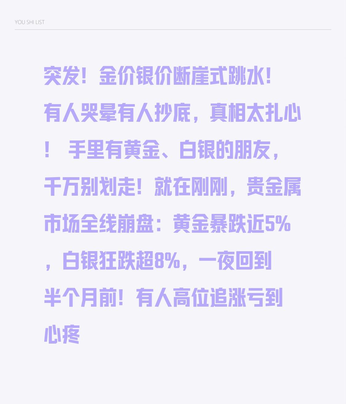 突发!金价银价断崖式跳水!有人哭晕有人抄底,真相太扎心! 手里有黄金、白银的朋友,千万别划走!就在刚刚,贵金属市场全线崩盘:黄金暴跌近5%,白银狂跌超8%,一夜回到半个月前!有人高位追涨亏到心疼,有人连夜冲进金店扫货,这波大跳水,到底发生了什么? 前几天还疯涨不停!中东一打仗,大家疯狂抢黄金避险,金价一路冲破历史高位,金店排队抢货,银行金条卖到断货,所有人都觉得:金银只会涨,不会跌! 转折点来了!一夜之间,行情彻底反转! 三大原因砸崩金价: 1. 中东局势没继续升级,避险资金疯狂出逃; 2. 美国降息预期推迟,美元强势反弹,直接压制金银; 3. 前期涨太猛,大户集中获利了结,引发连锁抛售! 尤其是白银,波动比黄金更大,直接闪崩跳水,很多人一觉醒来,账户直接缩水! 有人说:战争不是利好黄金吗?怎么越打越跌? 记住:买预期,卖事实!消息落地就是资金跑路时,再火的行情,也扛不住集中砸盘!普通老百姓追高最吃亏,涨的时候不敢买,跌的时候慌着卖。 这一轮大起大落,看懂的人吃肉,跟风的人挨打。金银不赌短期涨跌,只守长期安心。不管市场怎么变,普通人少碰杠杆,不盲目追高,不恐慌割肉,稳字当头才不会亏。 最后提醒:投资有风险,入市需谨慎。手里有余粮,心中不慌,安稳过日子,比什么都强!
