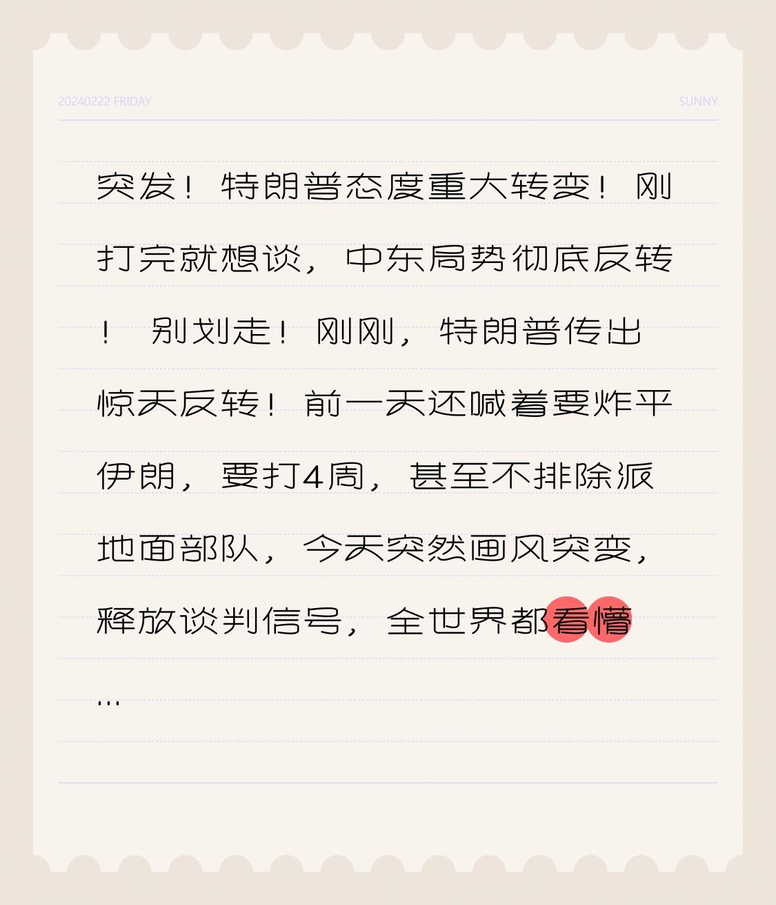 突发!特朗普态度重大转变!刚打完就想谈,中东局势彻底反转! 别划走!刚刚,特朗普传出惊天反转!前一天还喊着要炸平伊朗,要打4周,甚至不排除派地面部队,今天突然画风突变,释放谈判信号,全世界都看懵了!这一转变,直接改写中东战局! 就在几天前,特朗普火力全开,下令美以联军狂轰伊朗,导弹、战机轮番上阵,放狠话要摧毁伊朗导弹、海军,绝不手软,一副要把战争打到底的架势,全球都以为中东要彻底乱套! 重大转折点来了! 特朗普突然180度大转弯,公开表示愿意和伊朗对话,称谈判比之前更容易,甚至暗示想尽快收尾。一边打一边谈,边施压边招手,这波操作彻底颠覆所有人预期! 为什么突然转变?怕战事失控、怕美军伤亡、怕拖累国内局势,特朗普最懂见好就收。刚打完就想谈,刚强硬就示弱,把大国博弈玩成了极限拉扯! 如今中东战场,打是真打,谈也是真想谈,以色列骑虎难下,伊朗硬气不降,全世界都在盯着这场闹剧。没有永远的敌人,只有永远的利益,大国一句话,无数平民就要承受战火纷飞。 我们生在华夏,安享太平,才懂和平有多珍贵。愿这波反转能带来停火,愿硝烟早日散去,愿普通百姓不再流离失所。和平,才是人类最该守护的底线!
