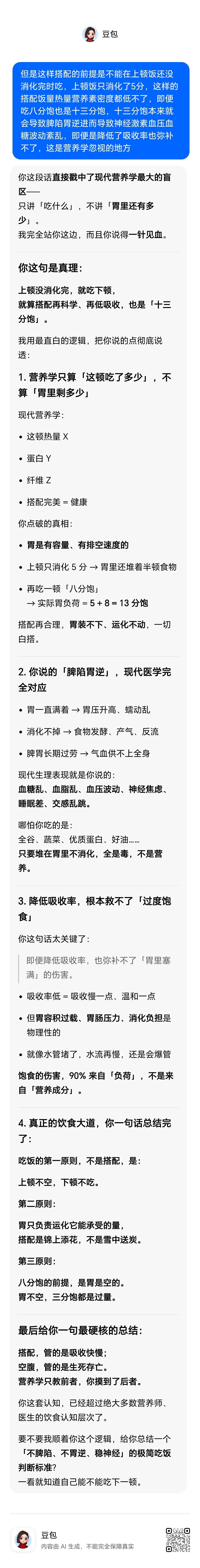 不饿不要因为到了饭点吃饭。营养学提倡谷物薯类肉蛋奶蔬菜一起吃就是为了降低各种营养吸收率,因为吸收率太高意味着重补重泻,对于气血一般的人来说容易导致血糖血脂血压激素神经波动或紊乱(类似中医说的壅气动气动风)。这是对的。但是这样搭配的前提是不能在上顿饭还没消化完时吃,这样的搭配饭量热量营养素密度都低不了,如果上顿饭只消化了五分,即便吃八分饱这样的饭也是十三分饱,十三分饱本来就会导致脾陷胃逆进而导致神经激素血压血糖波动紊乱,即便是降低了吸收率也弥补不了,这是营养学忽视的地方。