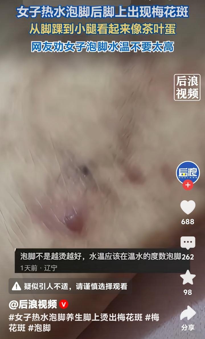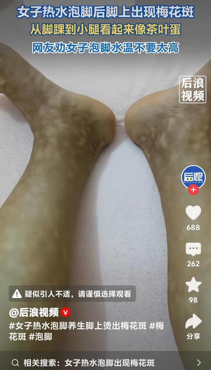 惊!广西女子泡脚竟泡出“梅花纹身”,专家紧急警告:你的养生正悄悄“烫伤”你! 当养生变成一种流行,谁曾想过,每晚那盆热气腾腾的泡脚水,可能正悄悄在你的皮肤上“作画”?近日,广西一位女子在热水泡脚后,小腿至脚踝惊现一片片宛如梅花烙印的斑纹,画面令人触目惊心。这并非什么艺术彩绘,而是身体发出的无声警报。 许多网友戏称其脚成了“茶叶蛋”,调侃之余更感同身受。原来,无数人都在追求那种“烫到发麻”的极致舒适感,仿佛水温不够高,就驱不散一身疲惫。这种对高温的迷恋,恰恰埋下了健康的隐患。皮肤用最直观的方式,控诉着过度的“热情”。 四川省中西医结合医院副主任中医师陈扬指出,这美丽的“梅花斑”实则是毛细血管在高温刺激下扩张充血所致。我们的皮肤远比想象中娇嫩,长时间承受超过45℃的热度,看似享受,实则是一种缓慢的“低温烫伤”。养生,首先得学会聆听身体的细微抗议。 那么,什么才是正确的泡脚方式?水温应控制在38-40℃的温暖范畴,而非滚烫。时间以15-30分钟为宜,并非越久越好。尤其对于糖尿病患者、下肢血管疾病患者等人群,过热泡脚可能导致无法挽回的损伤。养生之道,在于适度而非极致。 回看生活中,我们是否也常陷入类似的误区?以为汗水流得越多减肥越有效,以为吃得越素身体越干净……我们盲目追逐着各种“极致”养生法,却忽略了身体本真的需求。那朵“梅花”,烫伤的不仅是皮肤,更映照出当代人急于求成的焦虑心态。 真正的健康,从来不是通过自我折磨来获得的。它源于对身体的尊重与科学认知。停下那盆可能过烫的水,就像停下我们生活中那些“过犹不及”的执念。给身体一点温和的时空,它回馈你的将是长久而安稳的舒适。 所以,今晚当你准备泡脚时,请先用手腕内侧试水温,那才是皮肤能接受的温柔。别让养生的初衷,变成一场美丽的伤害。从这盆水开始,学会与自己的身体温柔相处。 (来源:后浪视频) 健康养生 泡脚禁忌