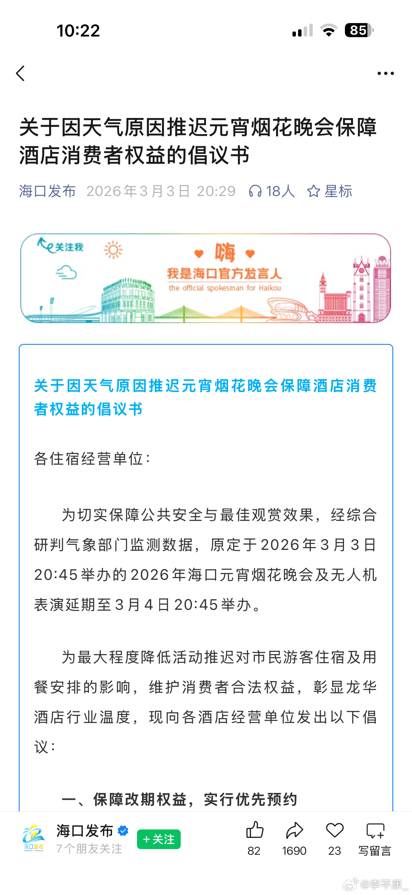 海口文旅对于元宵节活动因天气原因改期做出的一系列举措,还是挺负责任的!