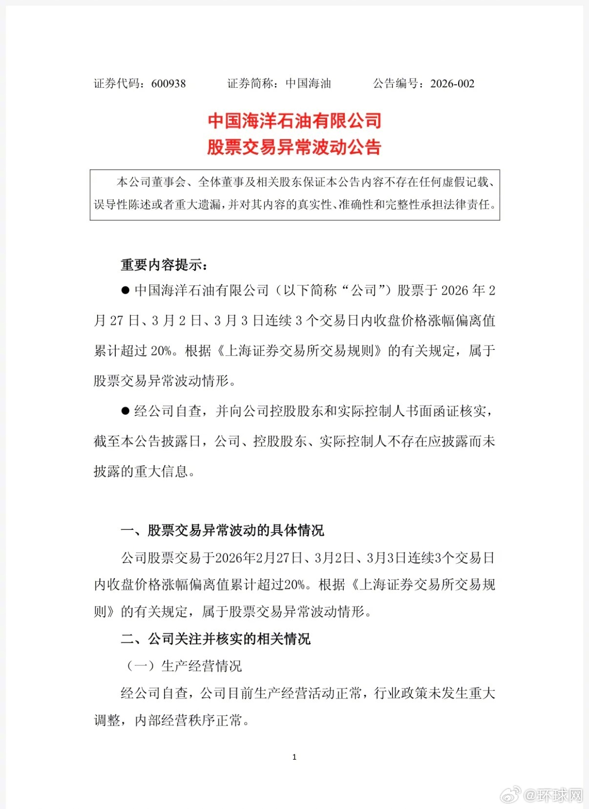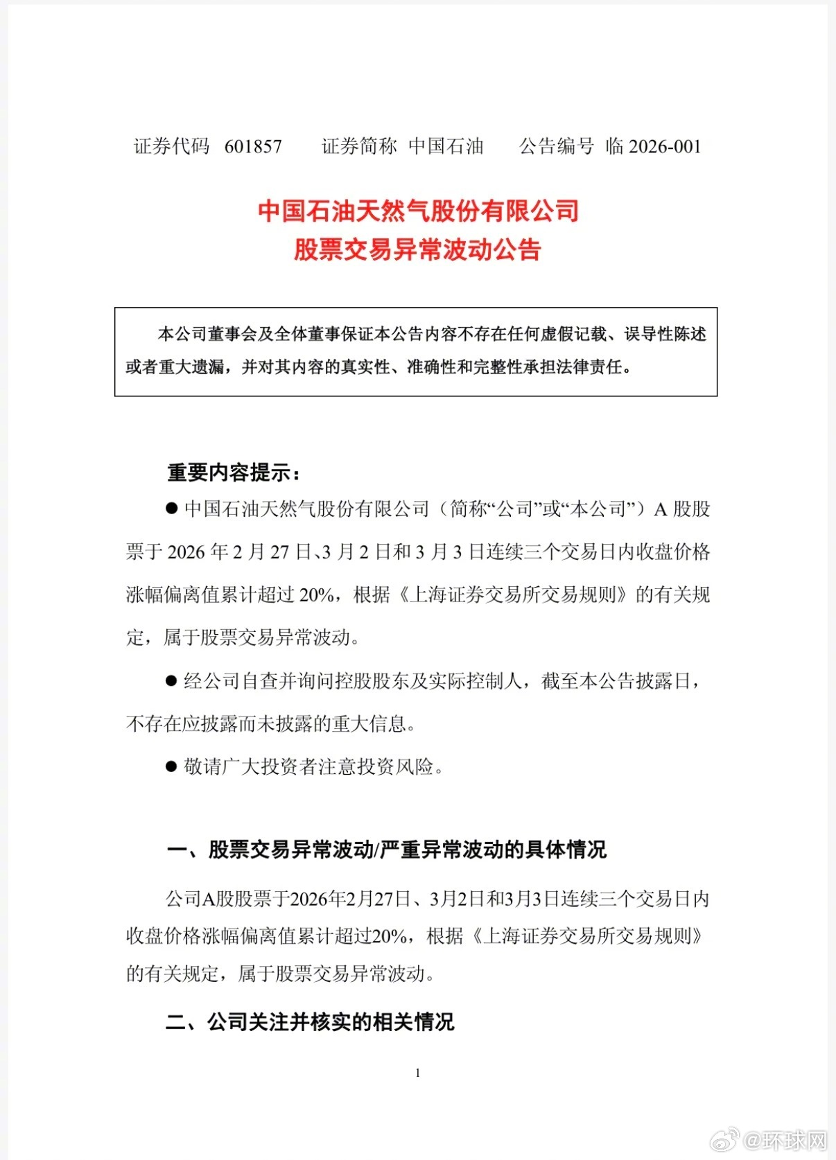 #中石油中石化中海油紧急发布公告#【中石油、中石化、中海油,紧急发布公告】3日晚间,中国石化、中国海油、中国石油接连发布股票交易异常波动公告,称公司股票于2月27日、3月2日、3月3日连续三个交易日内日收盘价格涨幅偏离值累计超过20%,属于股票交易异常波动情形。