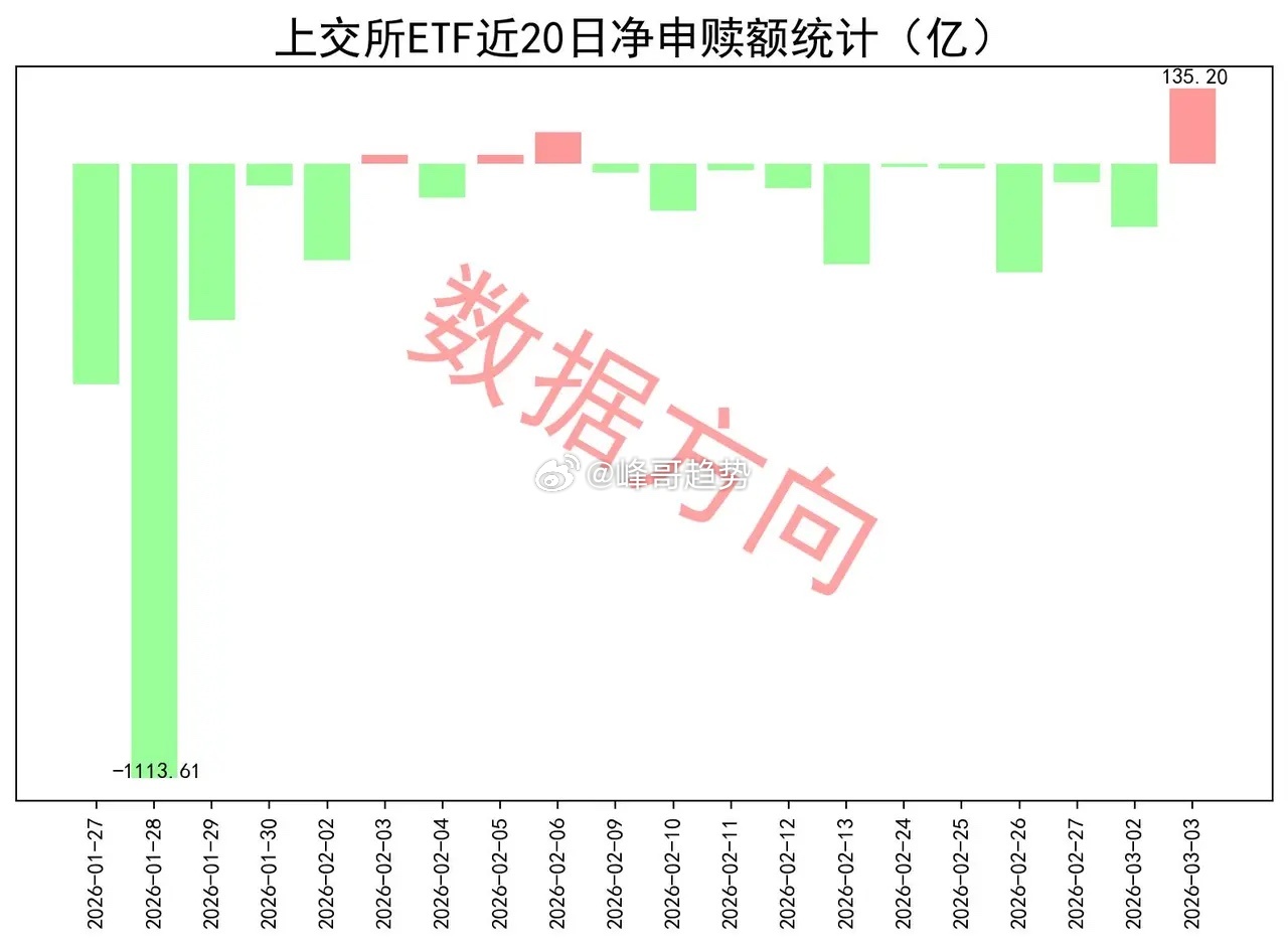 上证指数跌幅1.43%,上交所ETF合计净申购 135.2亿元,金额不算小,连续10天净赎回就止打住。