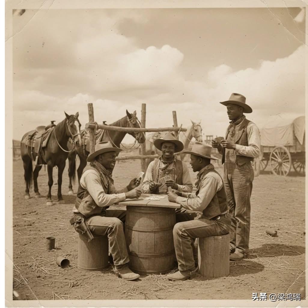 纸牌游戏(1886年):"非裔牛仔在尘土营地打牌,他们的友谊和欢笑。 “这张照片展示了他们生活的光明方面。 " 四位牛仔正围坐在一个木桶(充当临时桌子)旁玩扑克牌,其中三位坐着,一位站立,背景中有马匹和一辆当时常见的大篷车 (Chuck Wagon)。 他们佩戴着典型的宽檐牛仔帽,穿着粗糙耐磨的衬衫、马甲和牛仔裤,这些都是为了适应德克萨斯州恶劣的牧场环境。 拍摄地点: 德克萨斯州,OX 牧场 (OX Ranch) 地理范围: 该牧场横跨德克萨斯州的奇尔德里斯 (Childress)、哈德曼 (Hardeman) 和科特尔 (Cottle) 县,是当时牛群驱动和牛仔文化的重要中心。 这种类型的历史照片为了解 19 世纪末美国西部非裔美国牛仔的真实生活提供了宝贵的视觉资料,打破了流行文化中对牛仔形象的单一化描述。