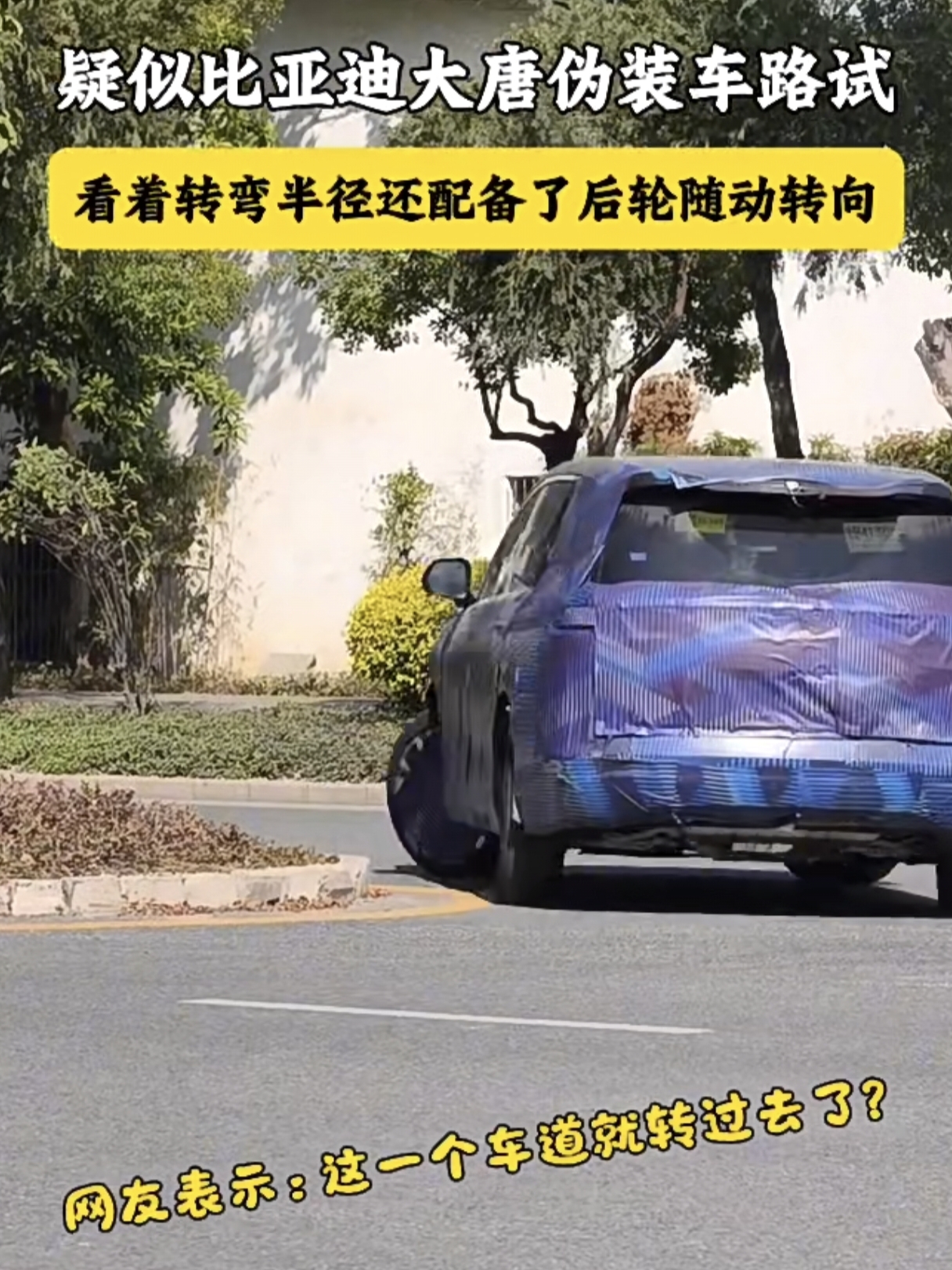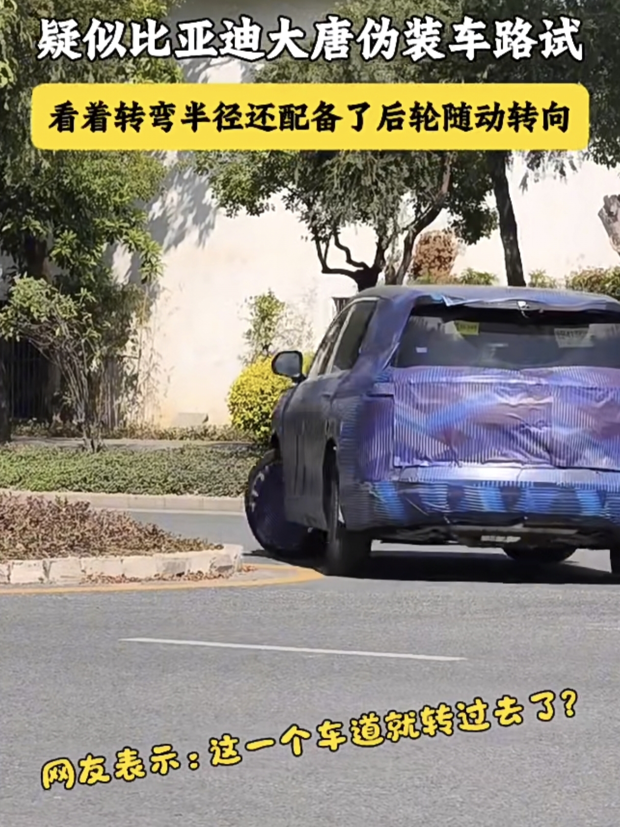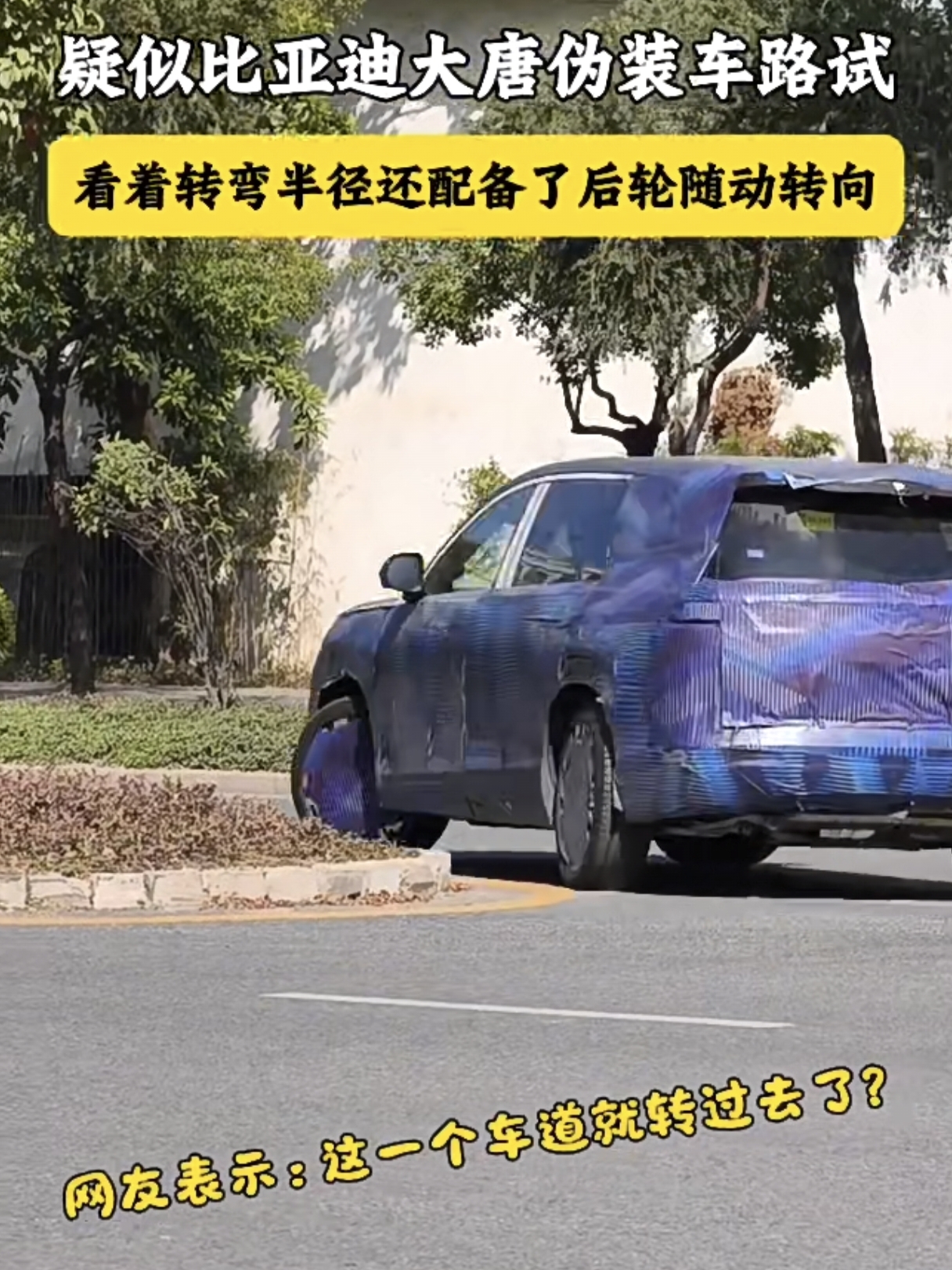 肉眼可见的后轮转向角度,过弯半径很小,很顺滑,对于一个七座SUV来讲,四轮转向简直是量身定制,比亚迪大唐做对了