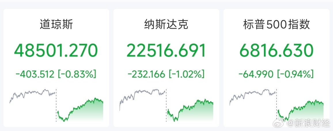 【美股三大指数全部收跌 】美东时间周二,美股三大指数集体收跌,因投资者担忧中东冲突可能持续升级,不过指数均自盘中低点明显回升。截至收盘,道指跌403.51点,跌幅为0.83%,报48501.27点;纳指跌232.17点,跌幅为1.02%,报22516.69点;标普500指数跌64.99点,跌幅为0.94%,报6816.63点。标普500指数的11个板块全面收跌,原材料板块跌2.69%,工业板块跌1.96%,信息技术/科技板块跌1.05%,能源板块跌0.94%,电信板块跌0.27%,金融板块跌0.18%。(财联社)